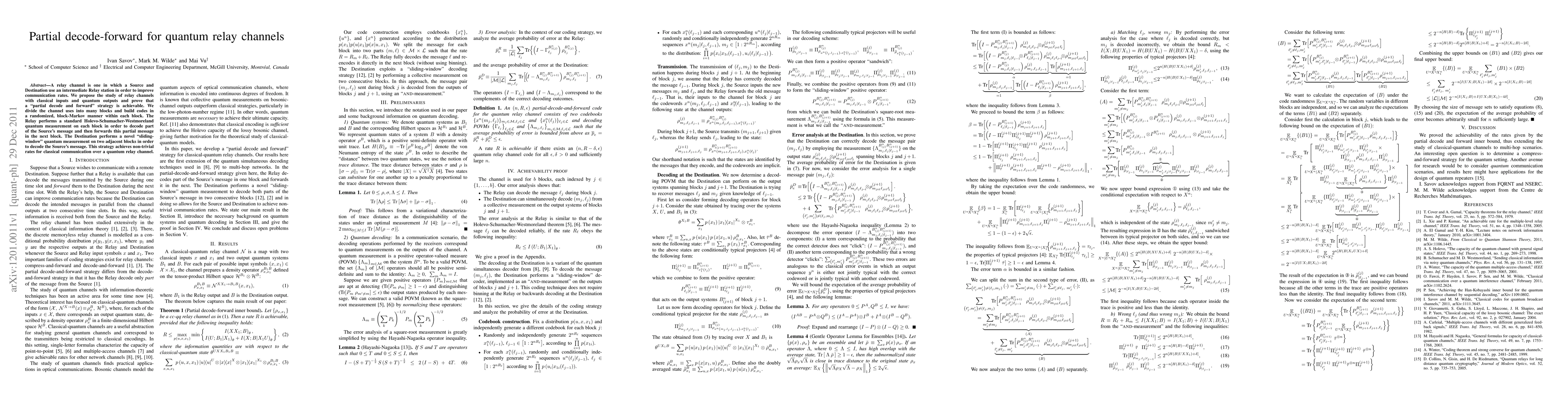 This paper proposes a "partial decode-forward" strategy for quantum relay channels, where a relay decodes part of the source's quantum message and forwards it, while the destination uses a sliding-window quantum measurement to decode the message across adjacent blocks, achieving non-trivial communication rates.