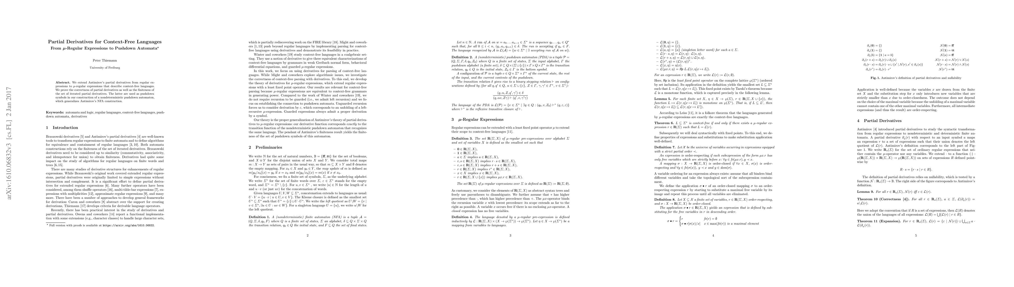 This paper extends Antimirov's partial derivatives from regular expressions to $\mu$-regular expressions for context-free languages, proving their correctness and finiteness. It constructs a nondeterministic pushdown automaton using these iterated partial derivatives.