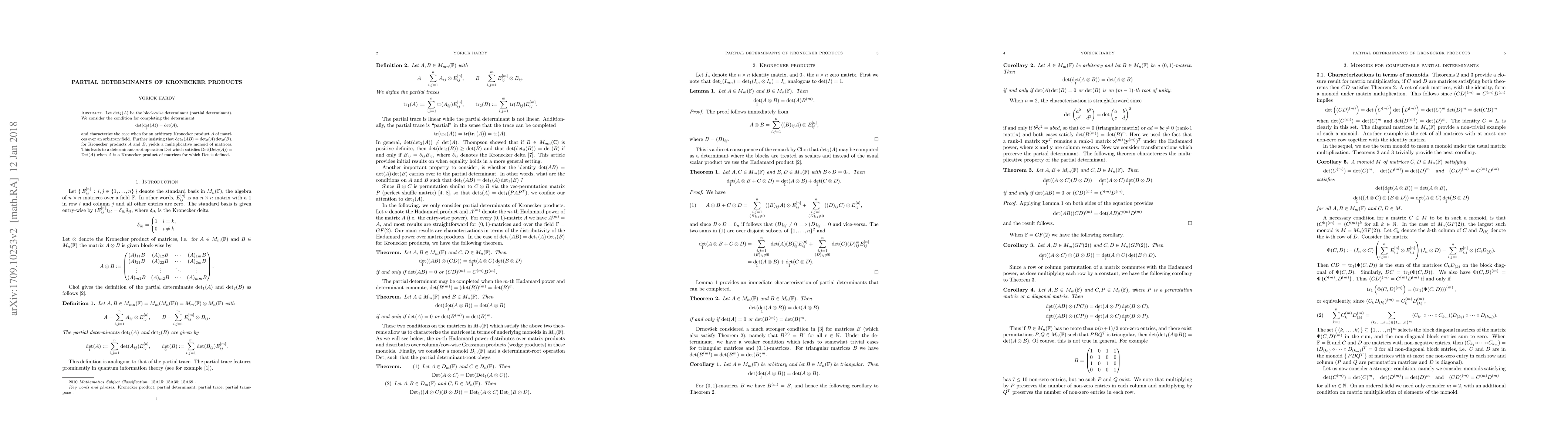 Let $\det_2(A)$ be the block-wise determinant (partial determinant). We consider the condition for completing the determinant $\det(\det_2(A)) = \det(A),$ and characterize the case for an arbitrary Kronecker product $A$ of matrices over an arbitrary field. Further insisting that $\det_2(AB)=\det_2(A)\det_2(B)$, for Kronecker products $A$ and $B$, yields a multiplicative monoid of matrices. This leads to a determinant-root operation $\text{Det}$ which satisfies $\text{Det}(\text{Det}_2(A)) = \text{Det}(A)$ when $A$ is a Kronecker product of matrices for which $\text{Det}$ is defined.