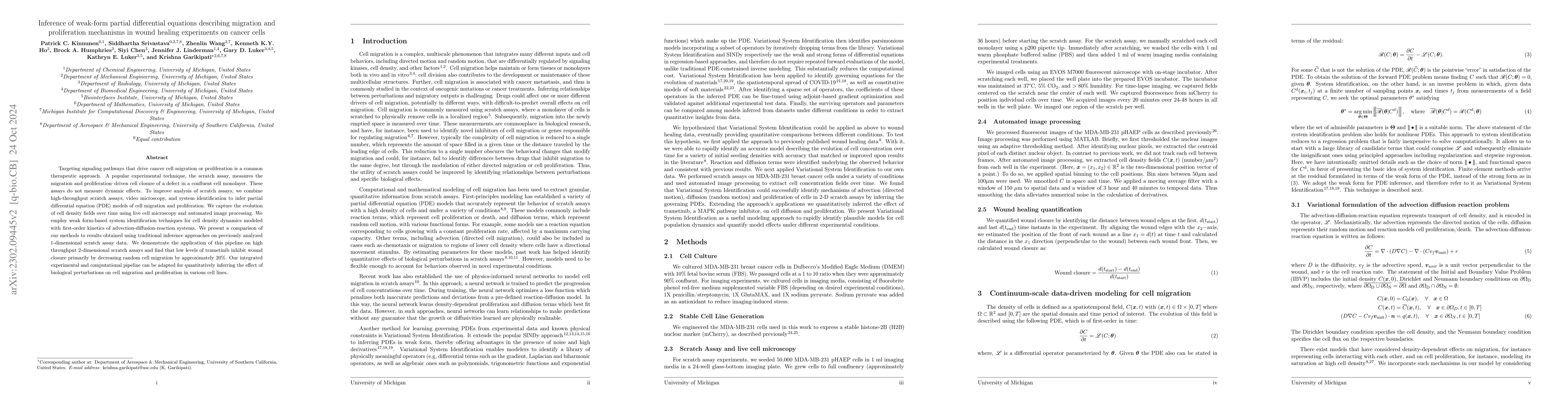 This paper combines high-throughput scratch assays, video microscopy, and variational system identification to infer PDE models of cancer cell migration and proliferation. The proposed method differentiates between migration and proliferation effects, revealing that lower serum levels can reduce random cell migration by about 20%.