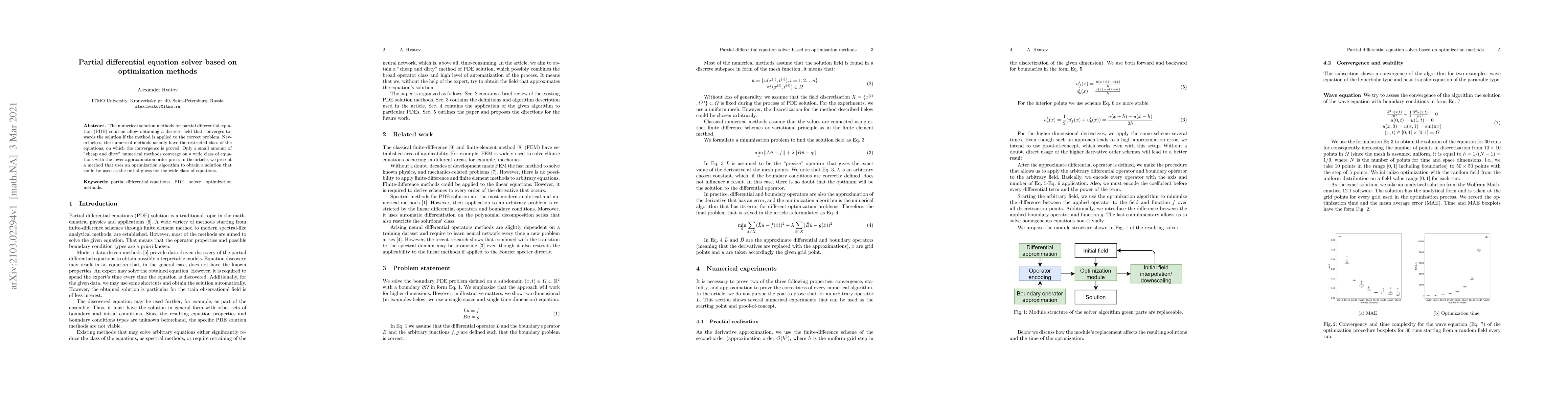 The numerical solution methods for partial differential equation (PDE) solution allow obtaining a discrete field that converges towards the solution if the method is applied to the correct problem. Nevertheless, the numerical methods usually have the restricted class of the equations, on which the convergence is proved. Only a small amount of "cheap and dirty" numerical methods converge on a wide class of equations with the lower approximation order price. In the article, we present a method that uses an optimization algorithm to obtain a solution that could be used as the initial guess for the wide class of equations.