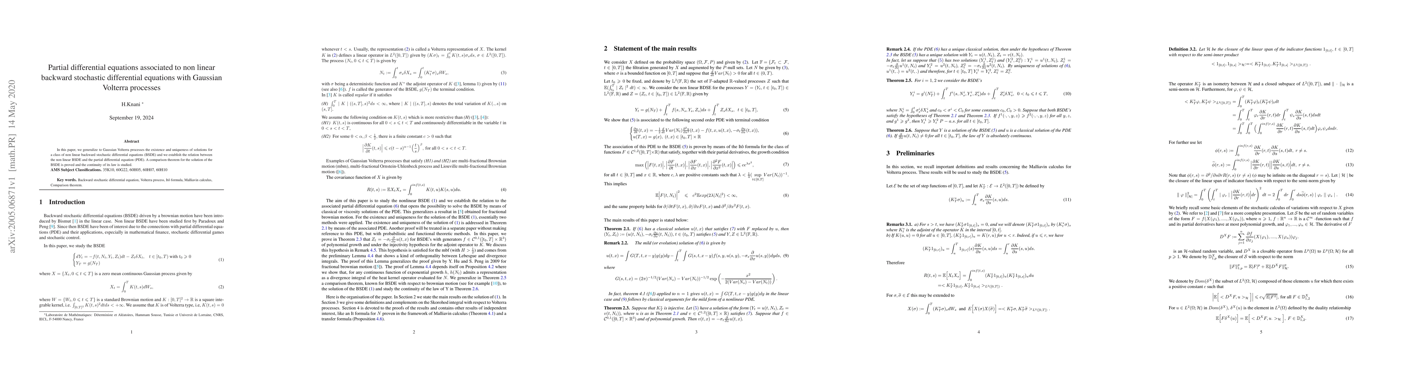 In this paper, we generalize to Gaussian Volterra processes the existence and uniqueness of solutions for a class of non linear backward stochastic differential equations (BSDE) and we establish the relation between the non linear BSDE and the partial differential equation (PDE). A comparison theorem for the solution of the BSDE is proved and the continuity of its law is studied.