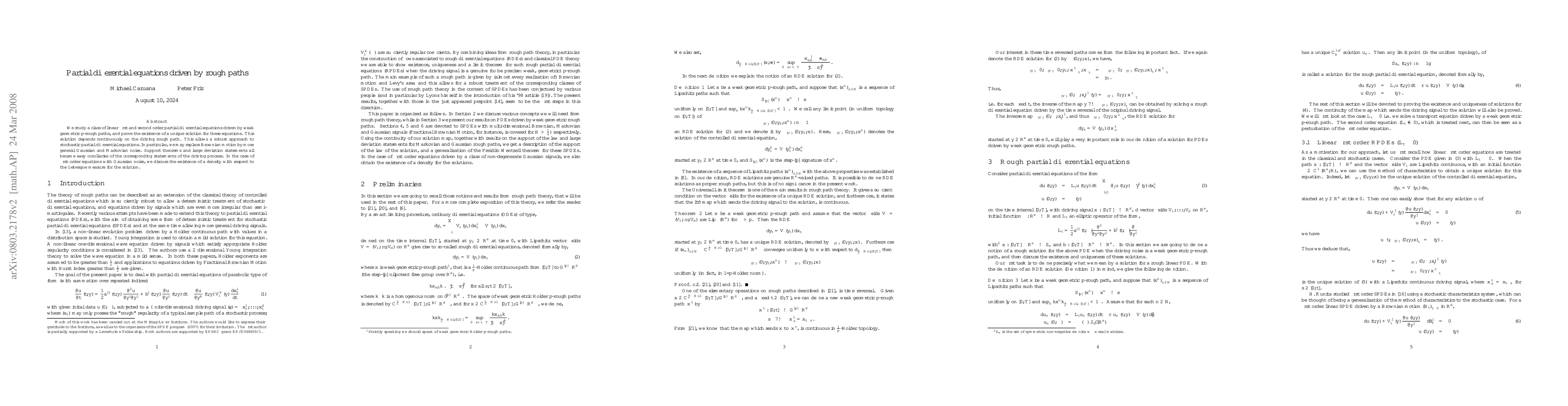 We study a class of linear first and second order partial differential equations driven by weak geometric $p$-rough paths, and prove the existence of a unique solution for these equations. This solution depends continuously on the driving rough path. This allows a robust approach to stochastic partial differential equations. In particular, we may replace Brownian motion by more general Gaussian and Markovian noise. Support theorems and large deviation statements all became easy corollaries of the corresponding statements of the driving process. In the case of first order equations with Gaussian noise, we discuss the existence of a density with respect to the Lebesgue measure for the solution.