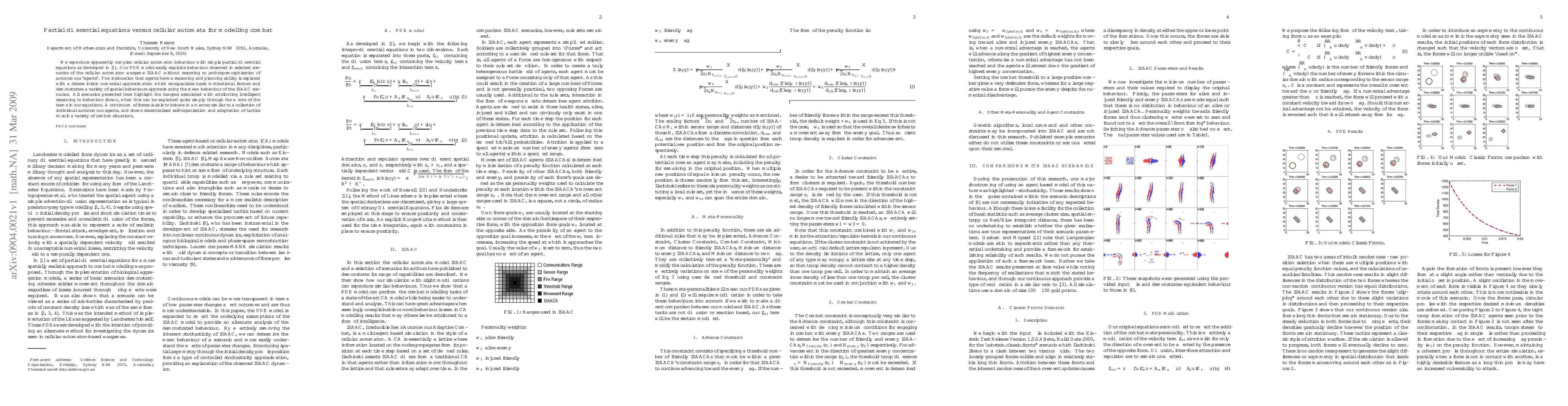We reproduce apparently complex cellular automaton behaviour with simple partial differential equations as developed in (Keane 09). Our PDE model easily explains behaviour observed in selected scenarios of the cellular automaton wargame ISAAC without resorting to anthropomorphisation of autonomous 'agents'. The insinuation that agents have a reasoning and planning ability is replaced with a deterministic numerical approximation which encapsulates basic motivational factors and demonstrates a variety of spatial behaviours approximating the mean behaviour of the ISAAC scenarios. All scenarios presented here highlight the dangers associated with attributing intelligent reasoning to behaviour shown, when this can be explained quite simply through the effects of the terms in our equations. A continuum of forces is able to behave in a manner similar to a collection of individual autonomous agents, and shows decentralised self-organisation and adaptation of tactics to suit a variety of combat situations.