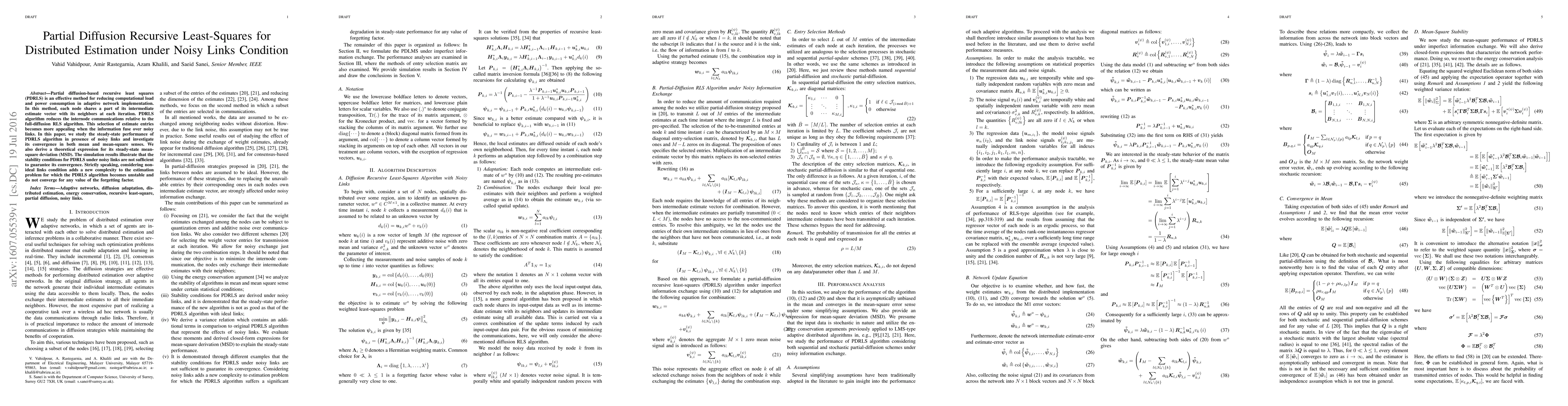 Researchers studied the steady-state performance of Partial Diffusion Recursive Least-Squares algorithm under noisy links conditions, finding it to be unstable and not convergent in such scenarios.