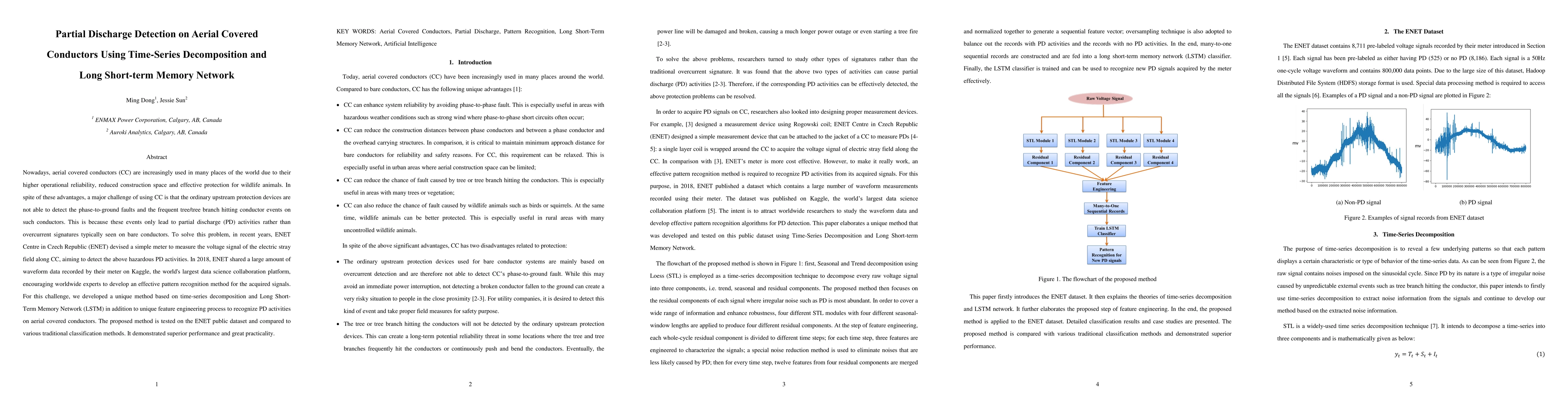 Nowadays, aerial covered conductors (CC) are increasingly used in many places of the world due to their higher operational reliability, reduced construction space and effective protection for wildlife animals. In spite of these advantages, a major challenge of using CC is that the ordinary upstream protection devices are not able to detect the phase-to-ground faults and the frequent tree/tree branch hitting conductor events on such conductors. This is because these events only lead to partial discharge (PD) activities rather than overcurrent signatures typically seen on bare conductors. To solve this problem, in recent years, ENET Center in Czech Republic (ENET) devised a simple meter to measure the voltage signal of the electric stray field along CC, aiming to detect the above hazardous PD activities. In 2018, ENET shared a large amount of waveform data recorded by their meter on Kaggle, the world's largest data science collaboration platform, encouraging worldwide experts to develop an effective pattern recognition method for the acquired signals. In response, we developed a unique method based on time-series decomposition and Long Short-Term Memory Network (LSTM) in addition to unique feature engineering process to recognize PD activities on CC. The proposed method is tested on the ENET public dataset and compared to various traditional classification methods. It demonstrated superior performance and great practicality.