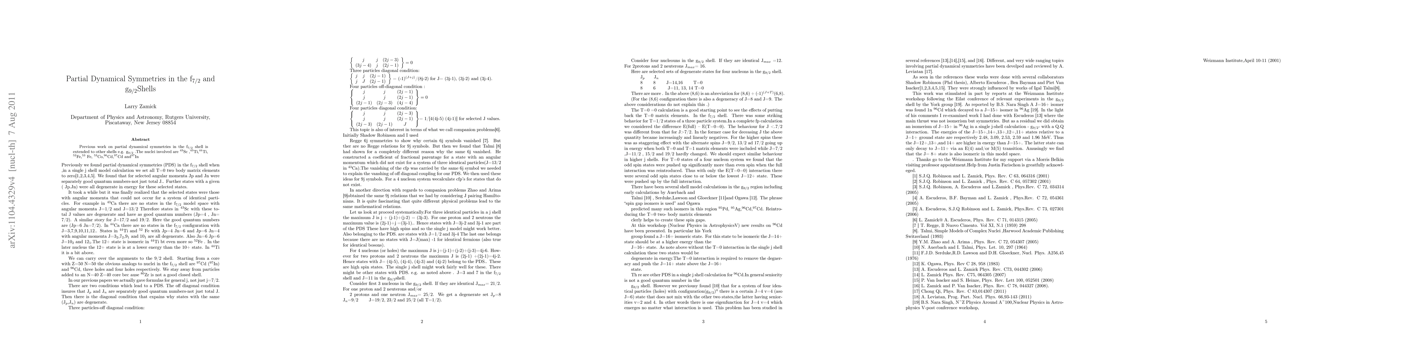 We discuss partial dynamical symmetries which occur in single j shell calculations mostly for high spin states for systems of three or four particles (holes). The relevant nuclei are 43Ti,43Sc, 44Ti, 52Fe,53Fe, 53Co,96Cd,97Cd, and 97In.