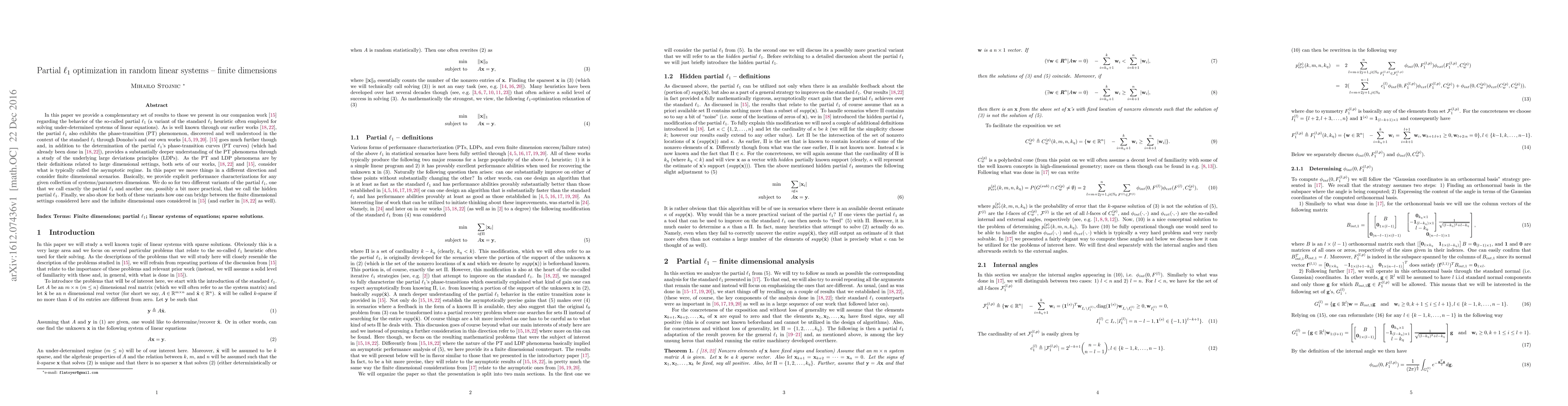 In this paper we provide a complementary set of results to those we present in our companion work \cite{Stojnicl1HidParasymldp} regarding the behavior of the so-called partial $\ell_1$ (a variant of the standard $\ell_1$ heuristic often employed for solving under-determined systems of linear equations). As is well known through our earlier works \cite{StojnicICASSP10knownsupp,StojnicTowBettCompSens13}, the partial $\ell_1$ also exhibits the phase-transition (PT) phenomenon, discovered and well understood in the context of the standard $\ell_1$ through Donoho's and our own works \cite{DonohoPol,DonohoUnsigned,StojnicCSetam09,StojnicUpper10}. \cite{Stojnicl1HidParasymldp} goes much further though and, in addition to the determination of the partial $\ell_1$'s phase-transition curves (PT curves) (which had already been done in \cite{StojnicICASSP10knownsupp,StojnicTowBettCompSens13}), provides a substantially deeper understanding of the PT phenomena through a study of the underlying large deviations principles (LDPs). As the PT and LDP phenomena are by their definitions related to large dimensional settings, both sets of our works, \cite{StojnicICASSP10knownsupp,StojnicTowBettCompSens13} and \cite{Stojnicl1HidParasymldp}, consider what is typically called the asymptotic regime. In this paper we move things in a different direction and consider finite dimensional scenarios. Basically, we provide explicit performance characterizations for any given collection of systems/parameters dimensions. We do so for two different variants of the partial $\ell_1$, one that we call exactly the partial $\ell_1$ and another one, possibly a bit more practical, that we call the hidden partial $\ell_1$.