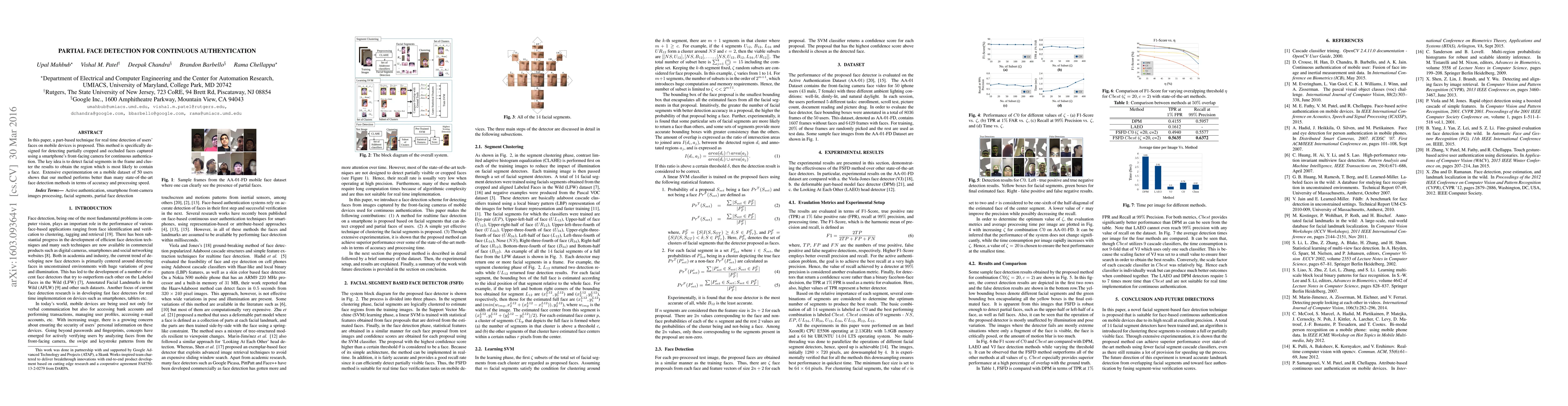 This paper proposes a part-based technique for real-time detection of partially cropped and occluded faces on mobile devices, specifically for continuous authentication. The method detects facial segments and clusters them to identify the most likely face region, outperforming state-of-the-art methods in accuracy and speed.