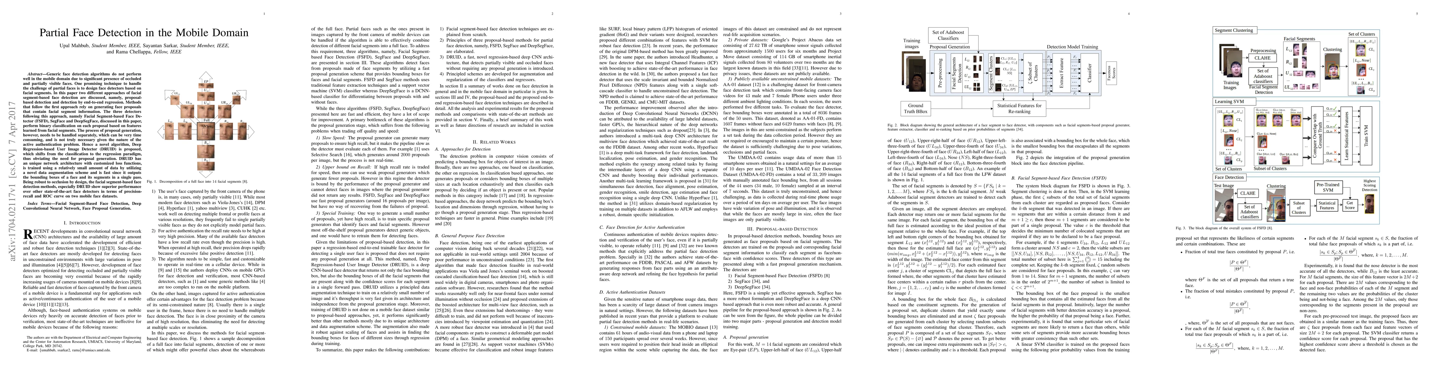 This paper proposes two facial segment-based face detection methods for mobile devices, addressing the challenge of occluded and partially visible faces. The first approach uses proposal-based detection, while the second, DRUID, employs end-to-end regression to directly output bounding boxes, showing superior performance in precision-recall and ROC metrics.