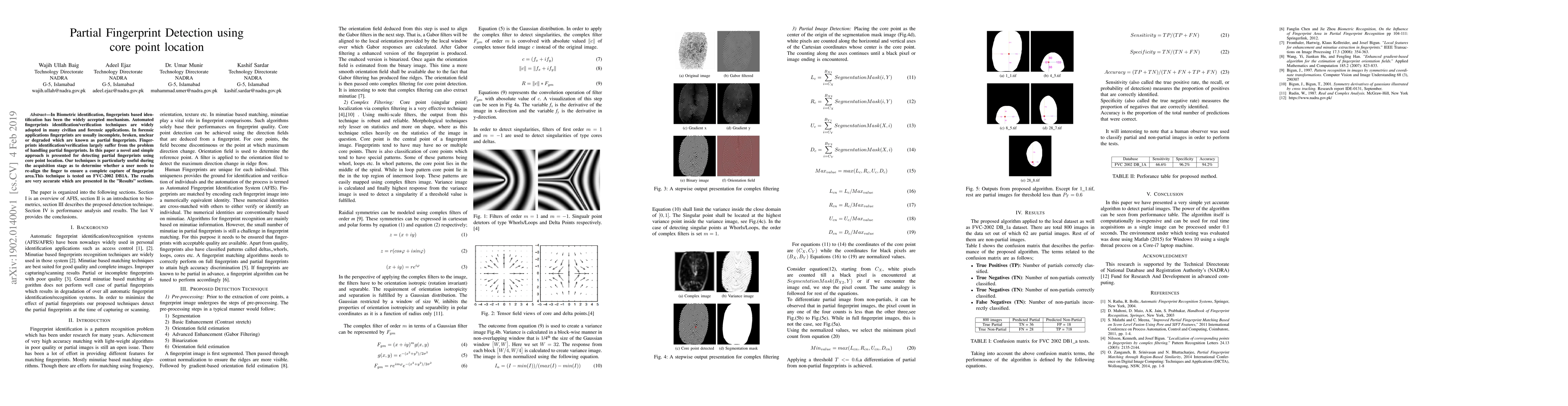 In Biometric identification, fingerprints based identification has been the widely accepted mechanism. Automated fingerprints identification/verification techniques are widely adopted in many civilian and forensic applications. In forensic applications fingerprints are usually incomplete, broken, unclear or degraded which are known as partial fingerprints. Fingerprints identification/verification largely suffer from the problem of handling partial fingerprints. In this paper a novel and simple approach is presented for detecting partial fingerprints using core point location. Our techniques is particularly useful during the acquisition stage as to determine whether a user needs to re-align the finger to ensure a complete capture of fingerprint area.This technique is tested on FVC-2002 DB1A. The results are very accurate which are presented in the Results sections.