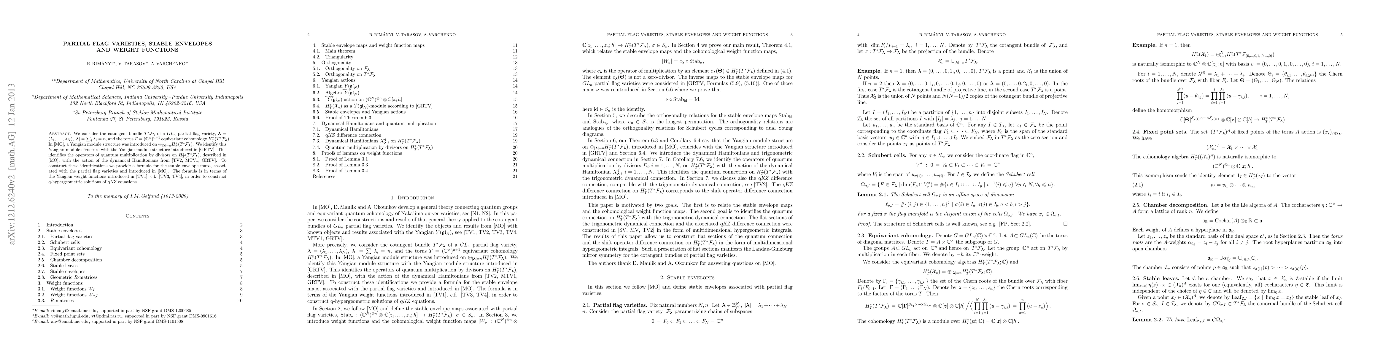 We consider the cotangent bundle T^*F_\lambda of a GL_n partial flag variety, \lambda = (\lambda_1,...,\lambda_N), |\lambda|=\sum_i\lambda_i=n, and the torus T=(C^*)^{n+1} equivariant cohomology H^*_T(T^*F_\lambda). In [MO], a Yangian module structure was introduced on \oplus_{|\lambda|=n} H^*_T(T^*F_\lambda). We identify this Yangian module structure with the Yangian module structure introduced in [GRTV]. This identifies the operators of quantum multiplication by divisors on H^*_T(T^*F_\lambda), described in [MO], with the action of the dynamical Hamiltonians from [TV2, MTV1, GRTV]. To construct these identifications we provide a formula for the stable envelope maps, associated with the partial flag varieties and introduced in [MO]. The formula is in terms of the Yangian weight functions introduced in [TV1], c.f. [TV3, TV4], in order to construct q-hypergeometric solutions of qKZ equations.