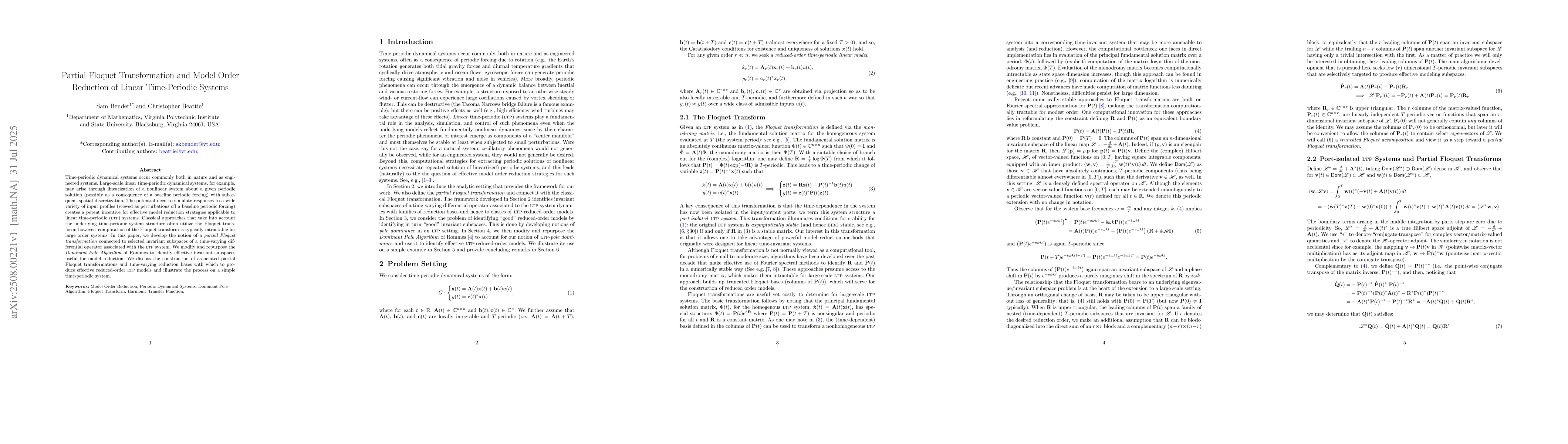 Time-periodic dynamical systems occur commonly both in nature and as engineered systems. Large-scale linear time-periodic dynamical systems, for example, may arise through linearization of a nonlinear system about a given periodic solution (possibly as a consequence of a baseline periodic forcing) with subsequent spatial discretization. The potential need to simulate responses to a wide variety of input profiles (viewed as perturbations off a baseline periodic forcing) creates a potent incentive for effective model reduction strategies applicable to linear time-periodic (LTP) systems. Classical approaches that take into account the underlying time-periodic system structure often utilize the Floquet transform; however, computation of the Floquet transform is typically intractable for large order systems. In this paper, we develop the notion of a partial Floquet transformation connected to selected invariant subspaces of a time-varying differential operator associated with the LTP system. We modify and repurpose the Dominant Pole Algorithm of Rommes to identify effective invariant subspaces useful for model reduction. We discuss the construction of associated partial Floquet transformations and time-varying reduction bases with which to produce effective reduced-order LTP models and illustrate the process on a simple time-periodic system.