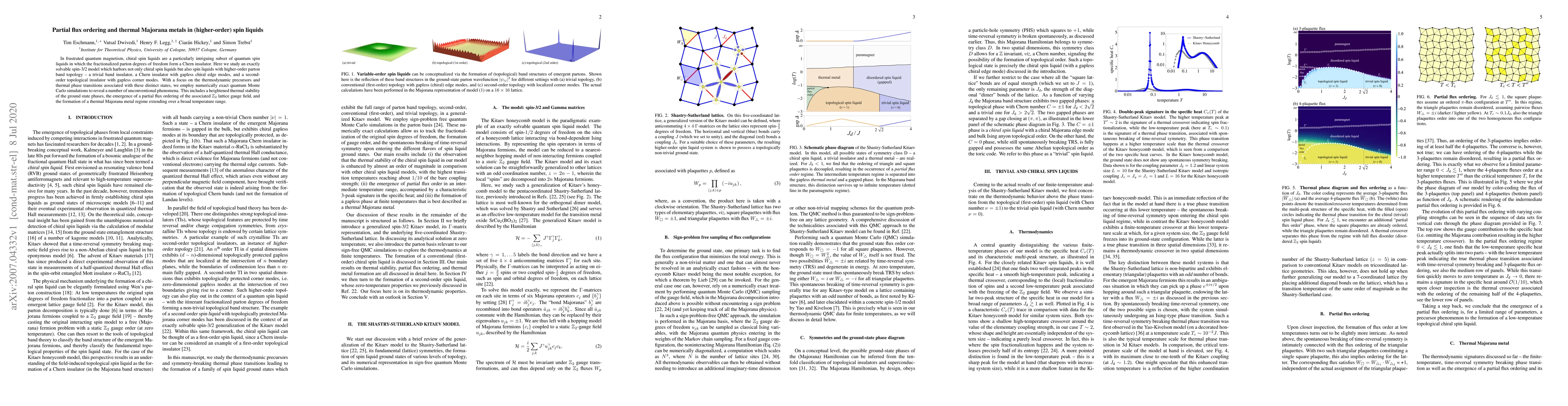 In frustrated quantum magnetism, chiral spin liquids are a particularly intriguing subset of quantum spin liquids in which the fractionalized parton degrees of freedom form a Chern insulator. Here we study an exactly solvable spin-3/2 model which harbors not only chiral spin liquids but also spin liquids with higher-order parton band topology -- a trivial band insulator, a Chern insulator with gapless chiral edge modes, and a second-order topological insulator with gapless corner modes. With a focus on the thermodynamic precursors and thermal phase transitions associated with these distinct states, we employ numerically exact quantum Monte Carlo simulations to reveal a number of unconventional phenomena. This includes a heightened thermal stability of the ground state phases, the emergence of a partial flux ordering of the associated $\mathbb{Z}_2$ lattice gauge field, and the formation of a thermal Majorana metal regime extending over a broad temperature range.
