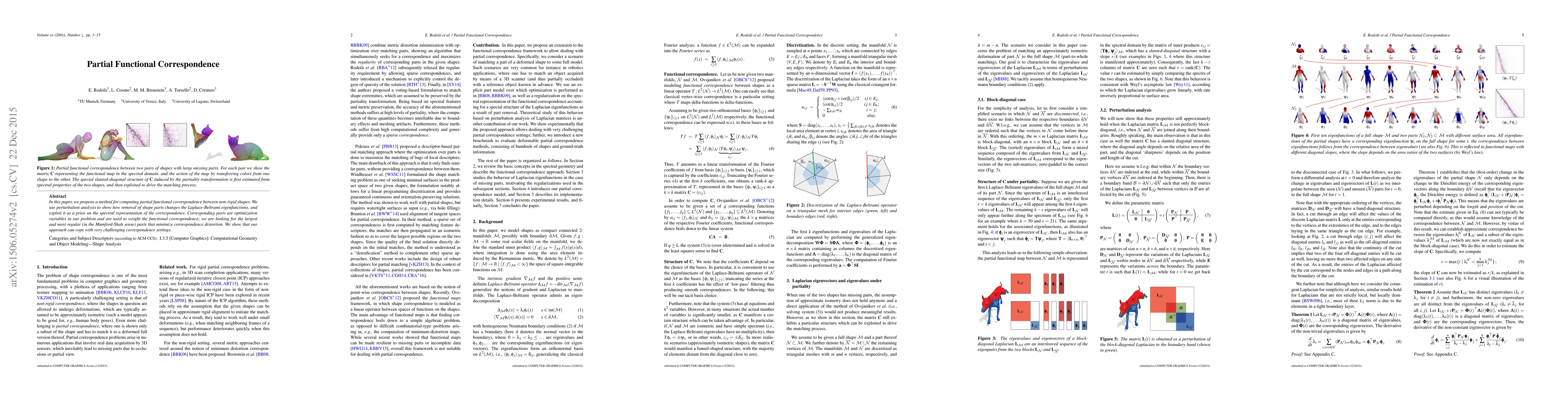In this paper, we propose a method for computing partial functional correspondence between non-rigid shapes. We use perturbation analysis to show how removal of shape parts changes the Laplace-Beltrami eigenfunctions, and exploit it as a prior on the spectral representation of the correspondence. Corresponding parts are optimization variables in our problem and are used to weight the functional correspondence; we are looking for the largest and most regular (in the Mumford-Shah sense) parts that minimize correspondence distortion. We show that our approach can cope with very challenging correspondence settings.