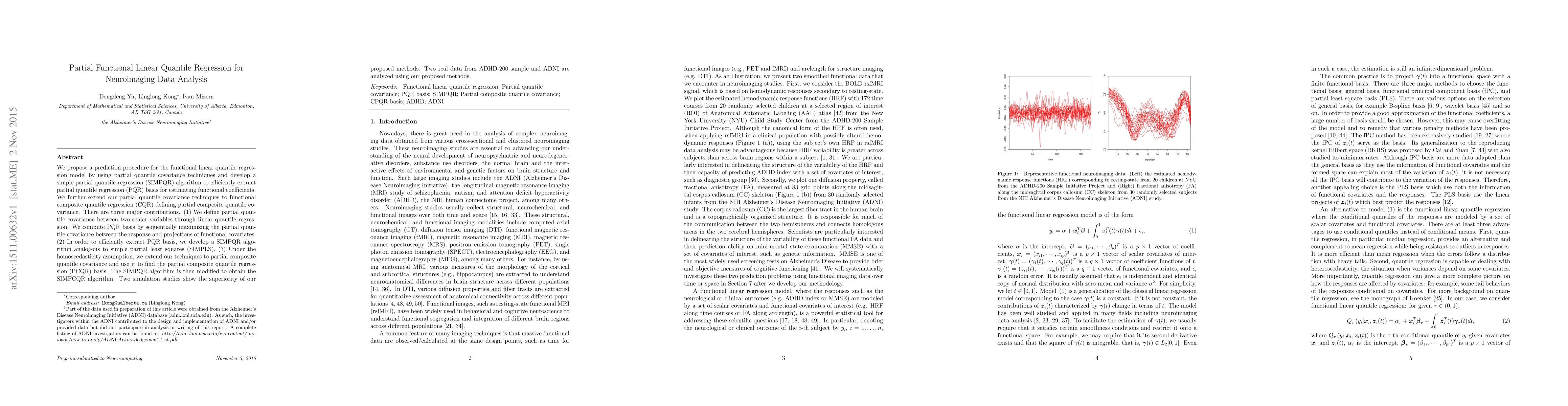 This paper introduces a novel partial functional linear quantile regression method for neuroimaging data, utilizing partial quantile covariance techniques and a SIMPQR algorithm to efficiently extract partial quantile regression basis. The authors extend their approach to functional composite quantile regression, demonstrating its effectiveness through simulations and real data analysis from ADHD-200 and ADNI datasets.