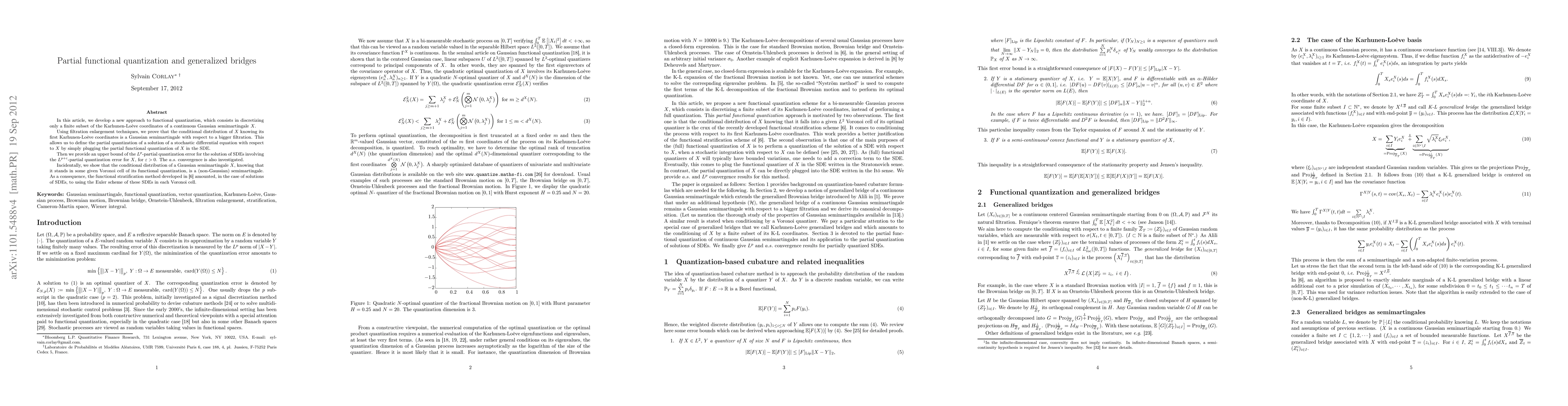 In this article, we develop a new approach to functional quantization, which consists in discretizing only a finite subset of the Karhunen-Lo\`eve coordinates of a continuous Gaussian semimartingale $X$. Using filtration enlargement techniques, we prove that the conditional distribution of $X$ knowing its first Karhunen-Lo\`eve coordinates is a Gaussian semimartingale with respect to a bigger filtration. This allows us to define the partial quantization of a solution of a stochastic differential equation with respect to $X$ by simply plugging the partial functional quantization of $X$ in the SDE. Then we provide an upper bound of the $L^p$-partial quantization error for the solution of SDEs involving the $L^{p+\varepsilon}$-partial quantization error for $X$, for $\varepsilon >0$. The $a.s.$ convergence is also investigated. Incidentally, we show that the conditional distribution of a Gaussian semimartingale $X$, knowing that it stands in some given Voronoi cell of its functional quantization, is a (non-Gaussian) semimartingale. As a consequence, the functional stratification method developed in [6] amounted, in the case of solutions of SDEs, to using the Euler scheme of these SDEs in each Voronoi cell.