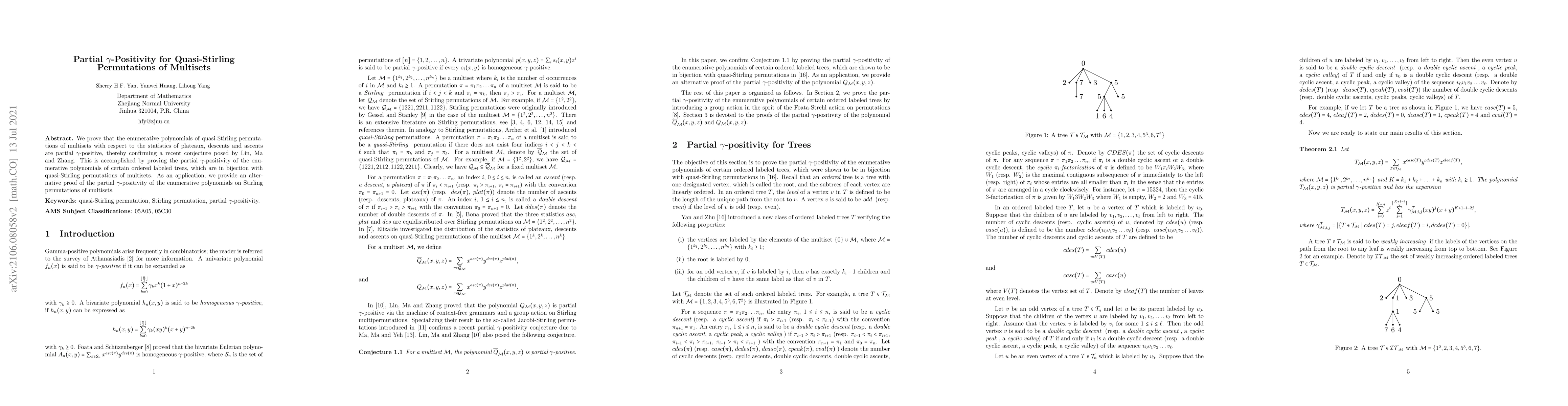This paper confirms a conjecture regarding the partial $\gamma$-positivity of quasi-Stirling permutations of multisets through the enumeration of plateaux, descents, and ascents. It achieves this by proving the partial $\gamma$-positivity of enumerative polynomials linked to ordered labeled trees, which correspond to these permutations.
