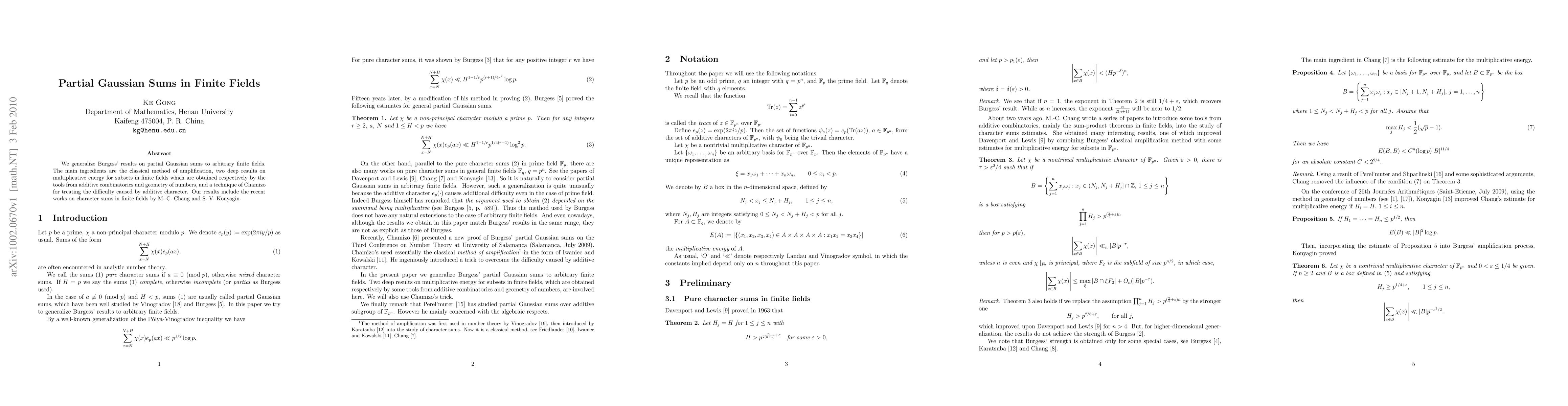 We generalize Burgess' results on partial Gaussian sums to arbitrary finite fields. The main ingredients are the classical method of amplification, two deep results on multiplicative energy for subsets in finite fields which are obtained respectively by the tools from additive combinatorics and geometry of numbers, and a technique of Chamizo for treating the difficulty caused by additive character. Our results include the recent works on character sums in finite fields by M.-C. Chang and S. V. Konyagin.