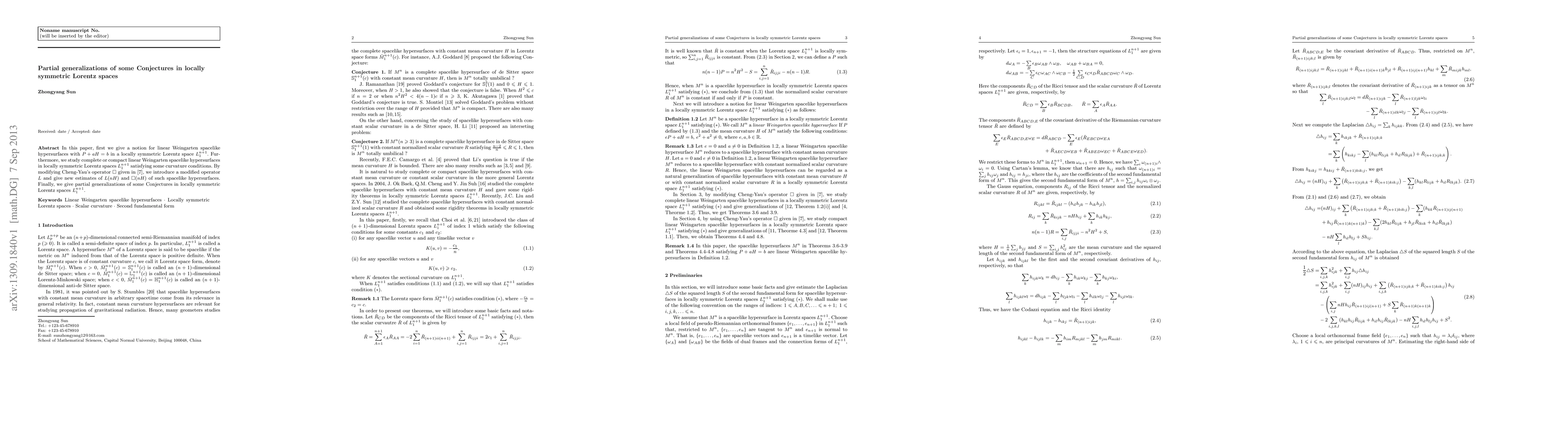 This paper explores linear Weingarten spacelike hypersurfaces in locally symmetric Lorentz spaces $L_{1}^{n+1}$ under the condition $P+aH=b$, introducing a modified operator $L$ to provide new estimates. It also partially generalizes conjectures in these spaces by studying the curvature conditions of complete or compact hypersurfaces.