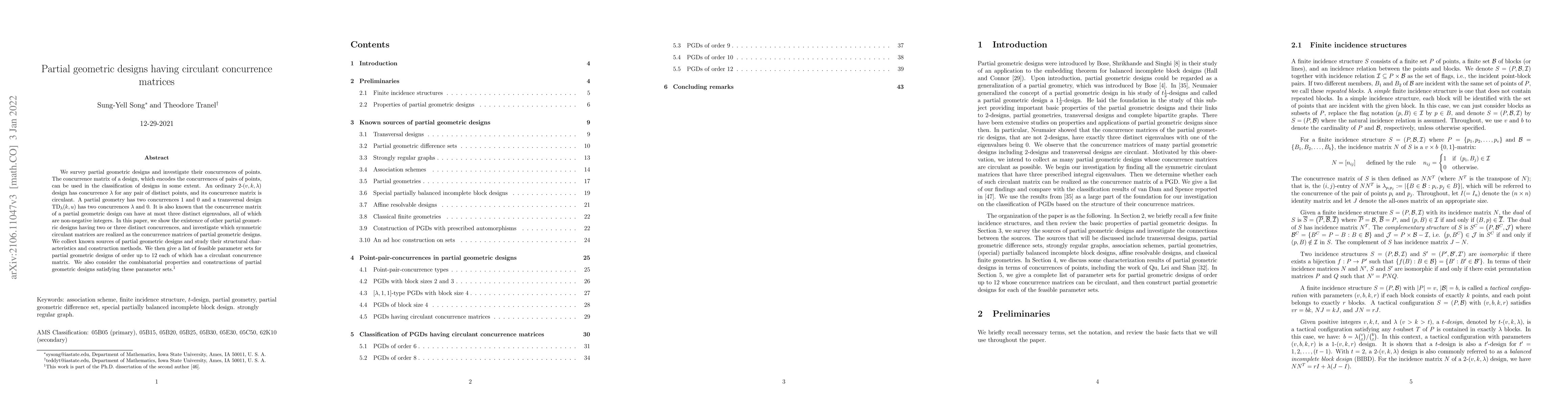 This paper surveys partial geometric designs, focusing on their concurrence matrices, which encode the concurrences of pairs of points. It explores designs with circulant concurrence matrices and identifies feasible parameter sets for partial geometric designs up to order 12, analyzing their structural characteristics and combinatorial constructions.