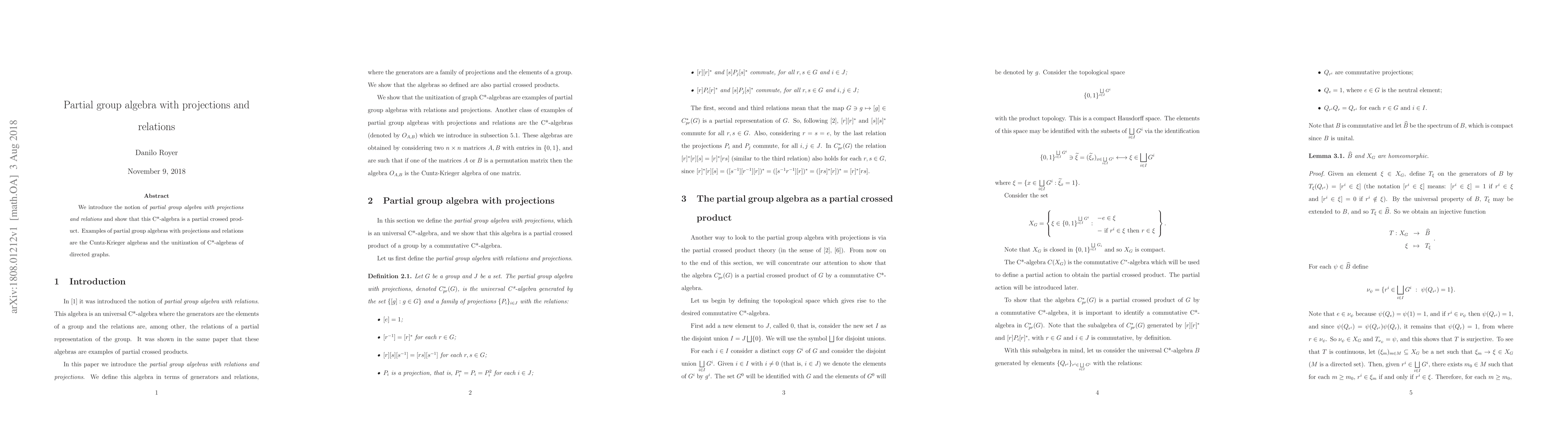 This paper introduces the concept of a partial group algebra with projections and relations, demonstrating that it forms a C*-algebra known as a partial crossed product. Examples include Cuntz-Krieger algebras and the unitization of C*-algebras derived from directed graphs.