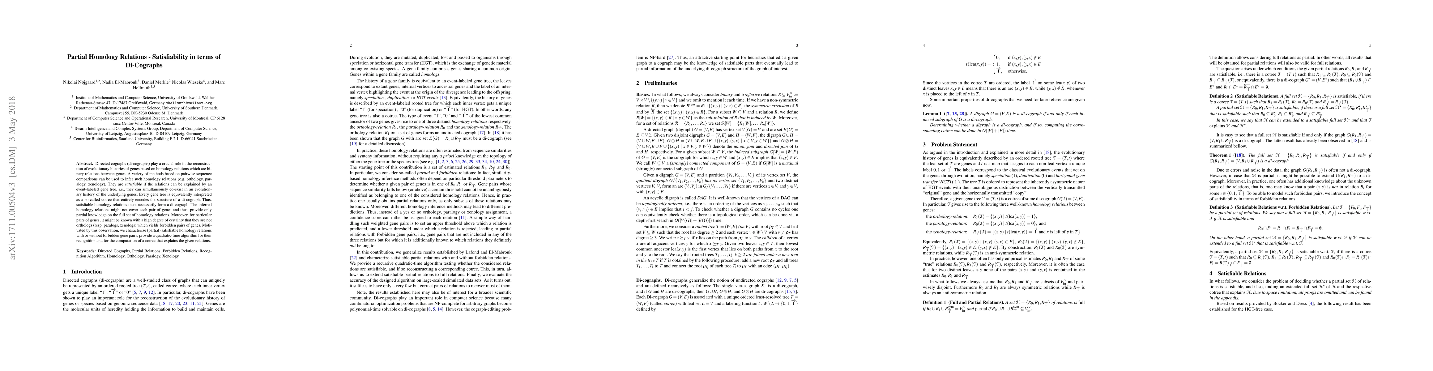This paper explores the satisfiability of partial homology relations in di-cographs, focusing on evolutionary gene histories. It provides a quadratic-time algorithm to recognize and compute cotrees that explain the given relations, even when forbidden gene pairs exist.