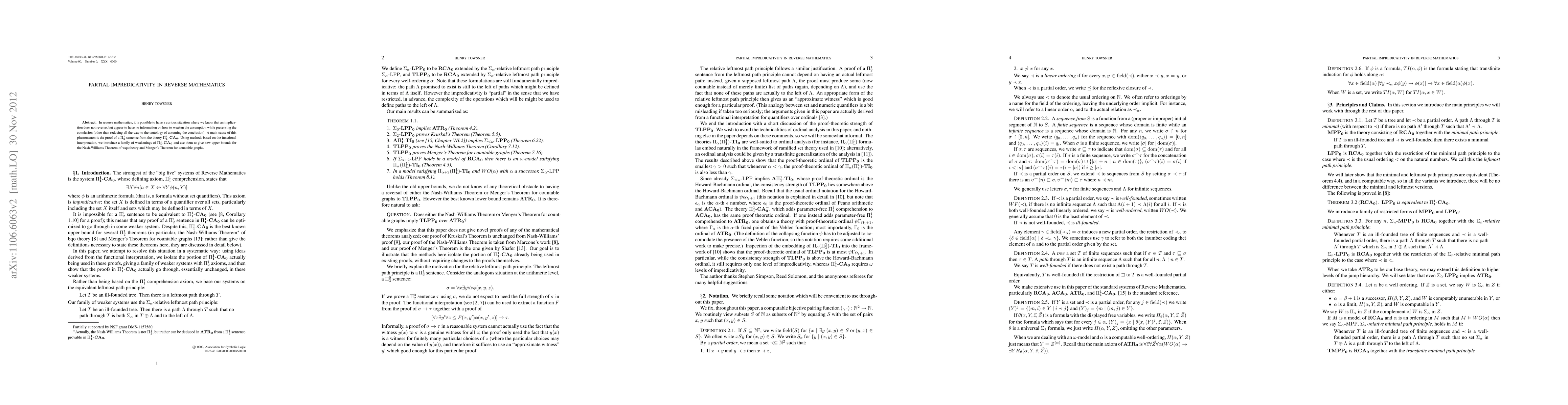 This paper explores partial impredicativity in reverse mathematics, identifying a phenomenon where implications do not reverse despite no clear way to weaken assumptions while preserving conclusions. It introduces new weakenings of the theory {\Pioo} using functional interpretation to provide upper bounds for the Nash-Williams Theorem and Menger's Theorem for countable graphs.