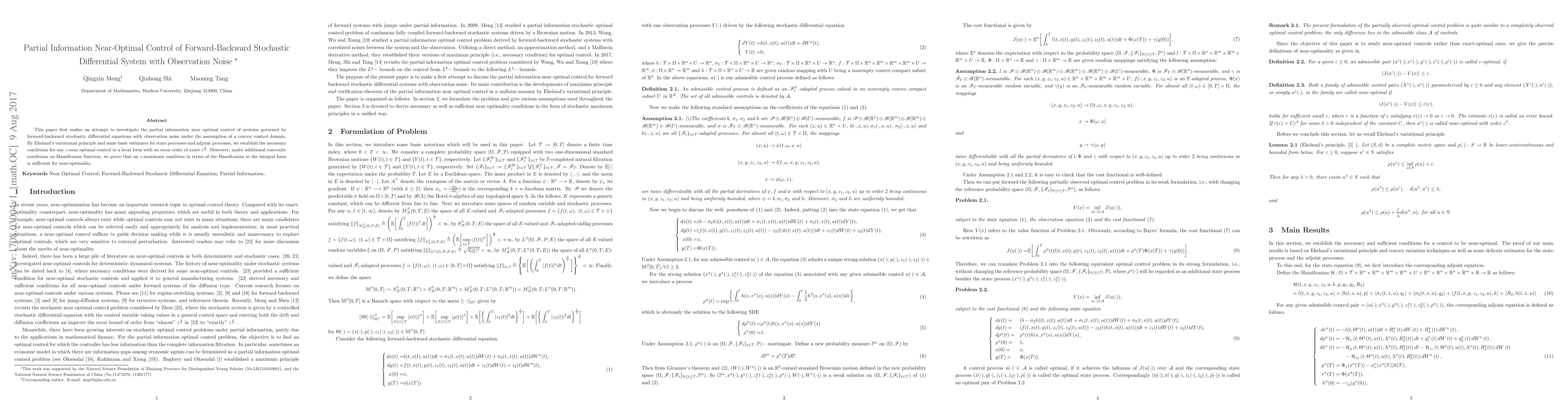 This paper explores partial information near-optimal control for forward-backward stochastic differential systems with observation noise, establishing necessary conditions for $\varepsilon$-near optimal control and proving sufficiency under additional convexity conditions on the Hamiltonian.
