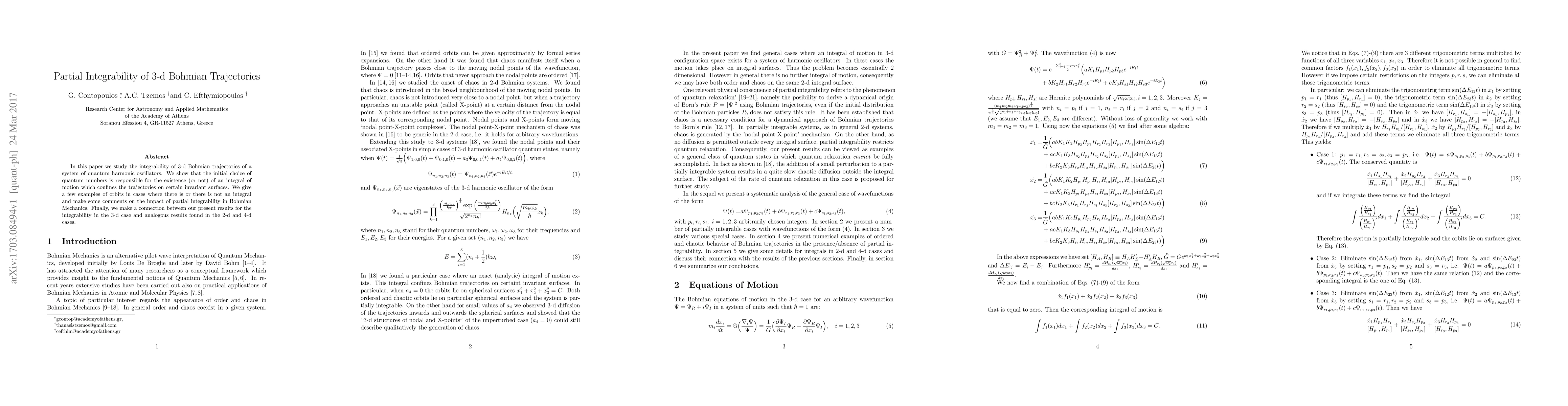 This paper investigates the partial integrability of 3-dimensional Bohmian trajectories for quantum harmonic oscillators, demonstrating that the choice of quantum numbers determines the presence of an integral of motion, confining trajectories on invariant surfaces. It connects these findings to analogous results in 2-d and 4-d cases.