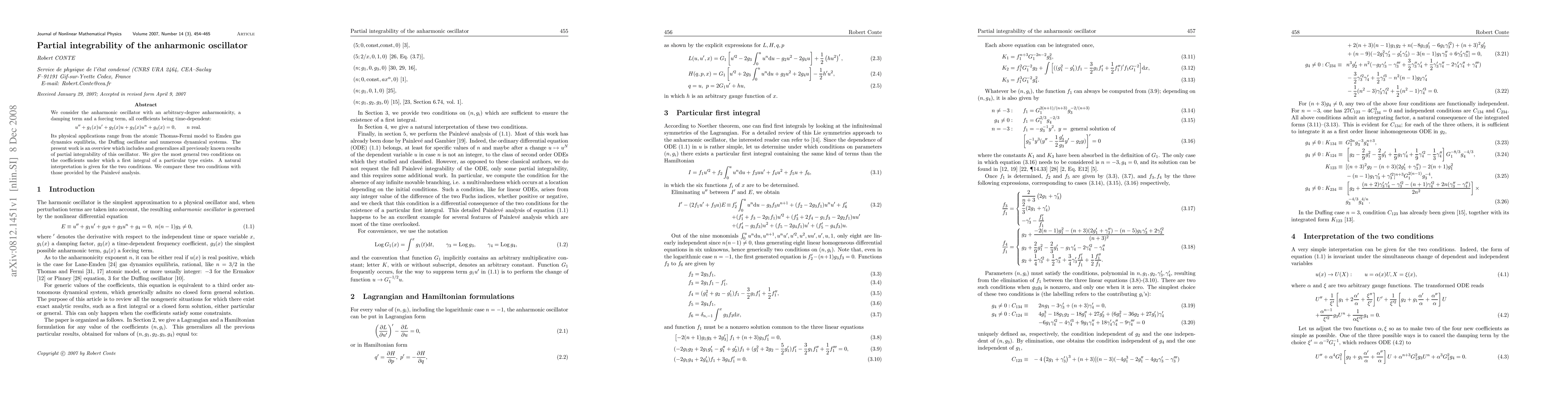 This paper reviews the partial integrability of the anharmonic oscillator, presenting generalized conditions for the existence of a first integral. It provides a comprehensive overview of previously known results and compares these conditions with those derived from Painlevé analysis.