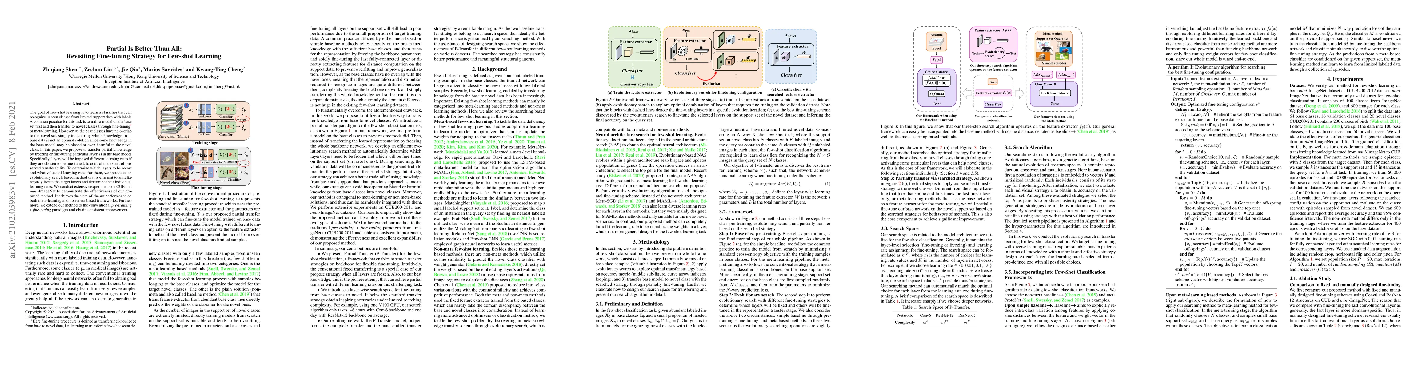 This paper proposes a fine-tuning strategy for few-shot learning that selectively transfers partial knowledge from base classes to novel classes by freezing or fine-tuning specific layers with adaptive learning rates, using an evolutionary search method for optimization. The method achieves state-of-the-art performance on CUB and mini-ImageNet datasets.