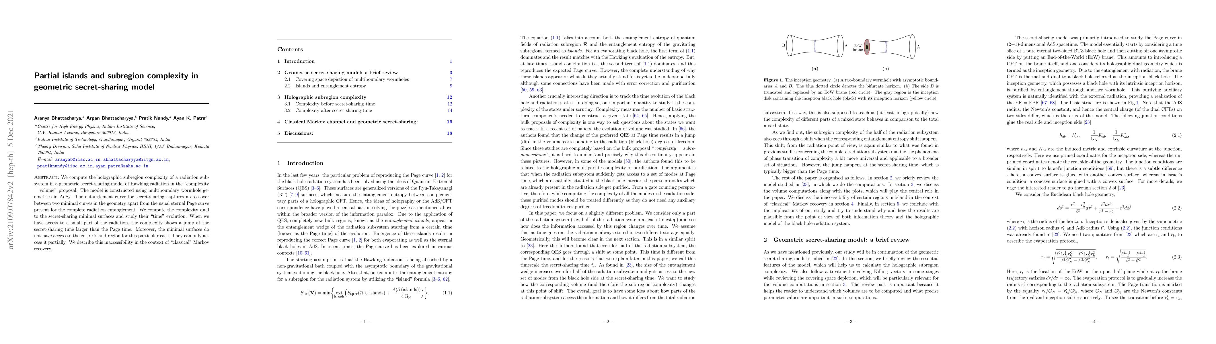 We compute the holographic subregion complexity of a radiation subsystem in a geometric secret-sharing model of Hawking radiation in the "complexity = volume" proposal. The model is constructed using multiboundary wormhole geometries in AdS$_{3}$. The entanglement curve for secret-sharing captures a crossover between two minimal curves in the geometry apart from the usual eternal Page curve present for the complete radiation entanglement. We compute the complexity dual to the secret-sharing minimal surfaces and study their "time" evolution. When we have access to a small part of the radiation, the complexity shows a jump at the secret-sharing time larger than the Page time. Moreover, the minimal surfaces do not have access to the entire island region for this particular case. They can only access it partially. We describe this inaccessibility in the context of "classical" Markov recovery.