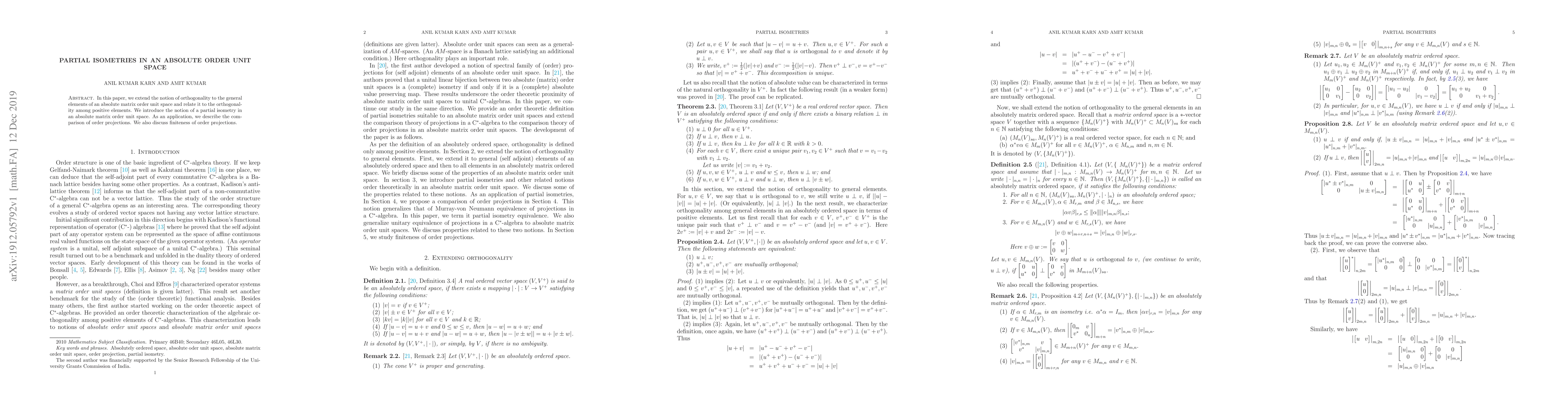 This paper extends orthogonality concepts to absolute matrix order unit spaces and introduces partial isometries within this framework. It applies these concepts to compare order projections and discusses the finiteness of such projections.
