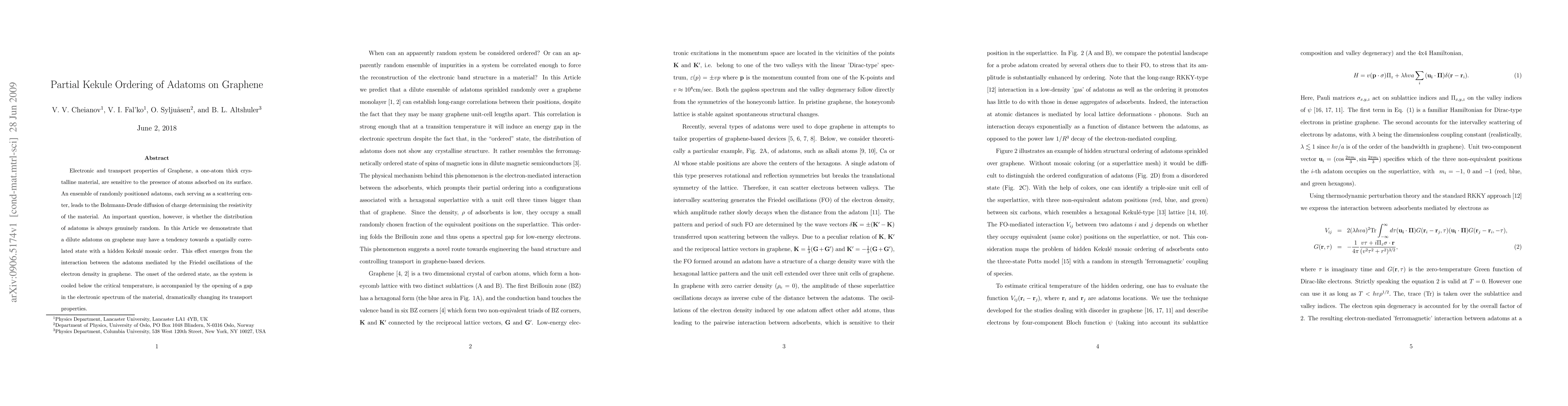 This paper demonstrates that dilute adatoms on graphene can exhibit a spatially correlated Kekule mosaic order due to interactions mediated by Friedel oscillations, leading to a gap opening in the electronic spectrum and significantly altering the material's transport properties.