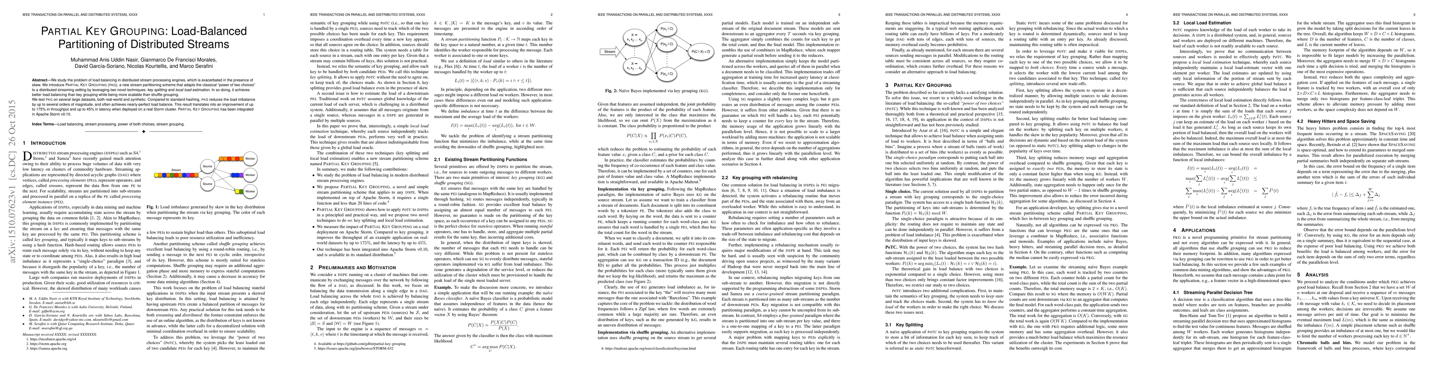 This paper proposes Partial Key Grouping (PKG), a new partitioning scheme for distributed stream processing to achieve better load balancing than existing methods, especially under data skew. PKG employs key splitting and local load estimation, resulting in up to 175% throughput improvement and 45% latency reduction in tests on real Storm clusters.