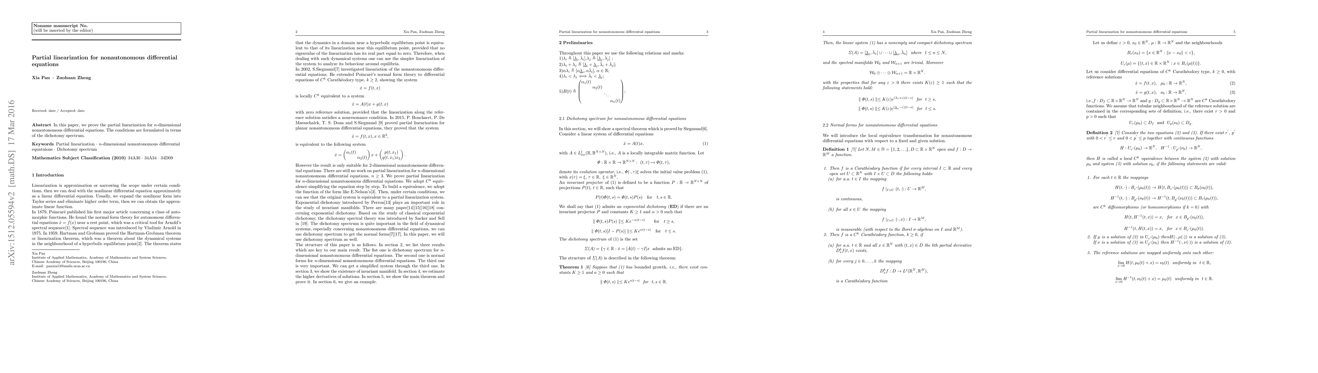 Summary: This paper establishes partial linearization for n-dimensional nonautonomous differential equations, with the conditions defined through the dichotomy spectrum. The methodology provides a framework for understanding the behavior of these complex systems.
