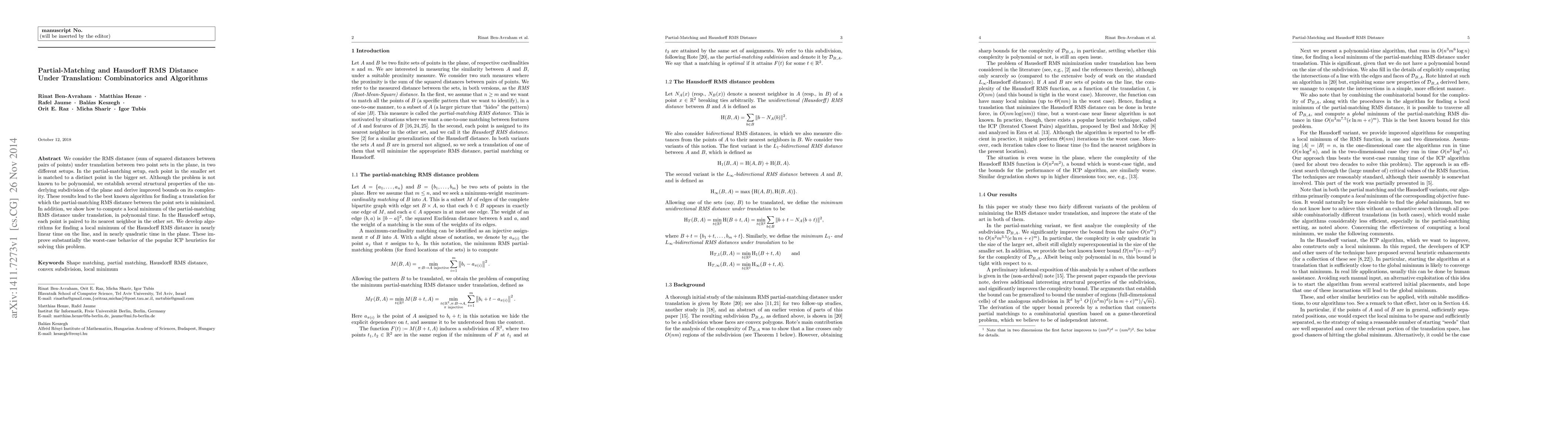 This paper explores the RMS distance under translation between two point sets in two setups: partial-matching and Hausdorff. It establishes structural properties and improved bounds for the partial-matching setup, leading to the best known algorithm for minimizing the distance. For the Hausdorff setup, it develops efficient algorithms for computing local minima in both linear and quadratic time.