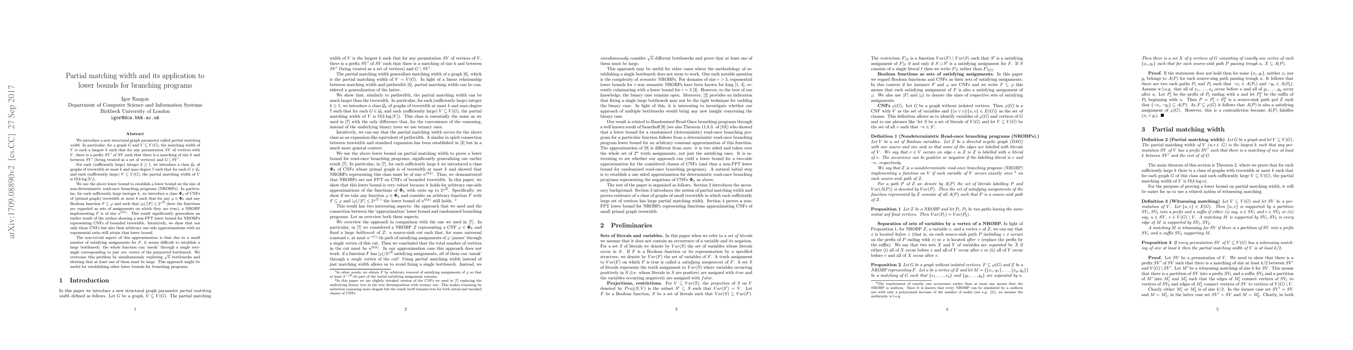 We introduce a new structural graph parameter called \emph{partial matching width}. For each (sufficiently large) integer $k \geq 1$, we introduce a class $\mathcal{G}_k$ of graphs of treewidth at most $k$ and max-degree $7$ such that for each $G \in \mathcal{G}_k$ and each (sufficiently large) $V \subseteq V(G)$, the partial matching width of $V$ is $\Omega(k \log |V|)$. We use the above lower bound to establish a lower bound on the size of non-deterministic read-once branching programs (NROBPs). In particular, for each sufficiently large ineteger $k$, we introduce a class ${\bf \Phi}_k$ of CNFs of (primal graph) treewidth at most $k$ such that for any $\varphi \in {\bf \Phi}_k$ and any Boolean function $F \subseteq \varphi$ and such that $|\varphi|/|F| \leq 2^{\sqrt{n}}$ (here the functions are regarded as sets of assignments on which they are true), a NROBP implementing $F$ is of size $n^{\Omega(k)}$. This result significantly generalises an earlier result of the author showing a non-FPT lower bound for NROBPs representing CNFs of bounded treewidth. Intuitively, we show that not only those CNFs but also their arbitrary one side approximations with an exponential ratio still attain that lower bound. The non-trivial aspect of this approximation is that due to a small number of satisfying assignments for $F$, it seems difficult to establish a large bottleneck: the whole function can `sneak' through a single rectangle corresponding to just \emph{one} vertex of the purported bottleneck. We overcome this problem by simultaneously exploring $\sqrt{n}$ bottlenecks and showing that at least one of them must be large. This approach might be useful for establishing other lower bounds for branching programs.