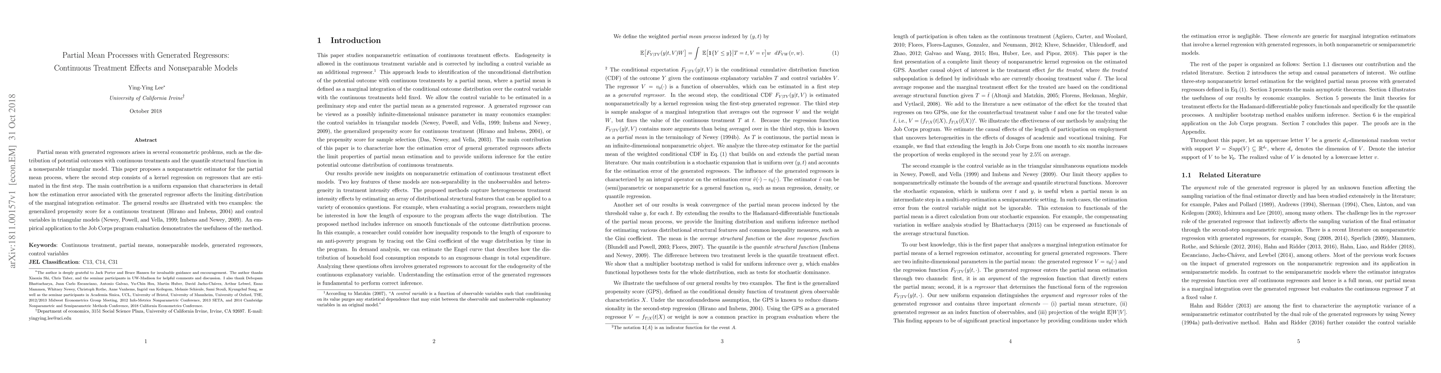This paper proposes a nonparametric estimator for the partial mean process with generated regressors, focusing on the continuous treatment effects and nonseparable models. It introduces a uniform expansion to detail the impact of estimation error on the marginal integration estimator, illustrated through examples like the generalized propensity score and control variables in triangular models.