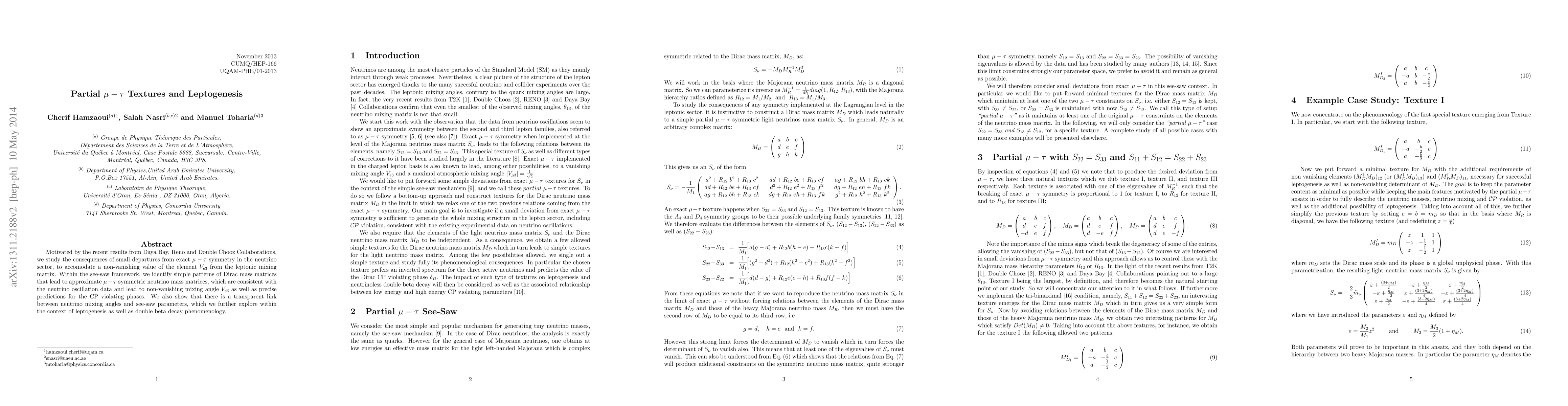 Motivated by the recent results from Daya Bay, Reno and Double Chooz Collaborations, we study the consequences of small departures from exact $\mu-\tau$ symmetry in the neutrino sector, to accommodate a non-vanishing value of the element $V_{e3}$ from the leptonic mixing matrix. Within the see-saw framework, we identify simple patterns of Dirac mass matrices that lead to approximate $\mu-\tau$ symmetric neutrino mass matrices, which are consistent with the neutrino oscillation data and lead to non-vanishing mixing angle $V_{e3}$ as well as precise predictions for the CP violating phases. We also show that there is a transparent link between neutrino mixing angles and see-saw parameters, which we further explore within the context of leptogenesis as well as double beta decay phenomenology.