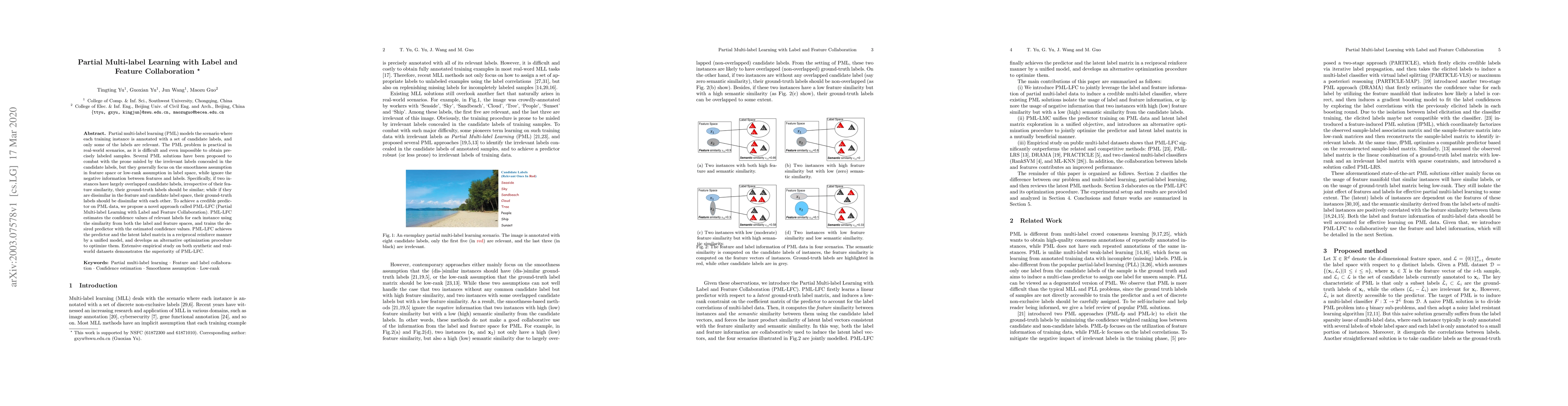 PML-LFC proposes a novel approach to partial multi-label learning that uses collaboration between label and feature spaces to estimate confidence values for relevant labels and trains a predictor with these values.