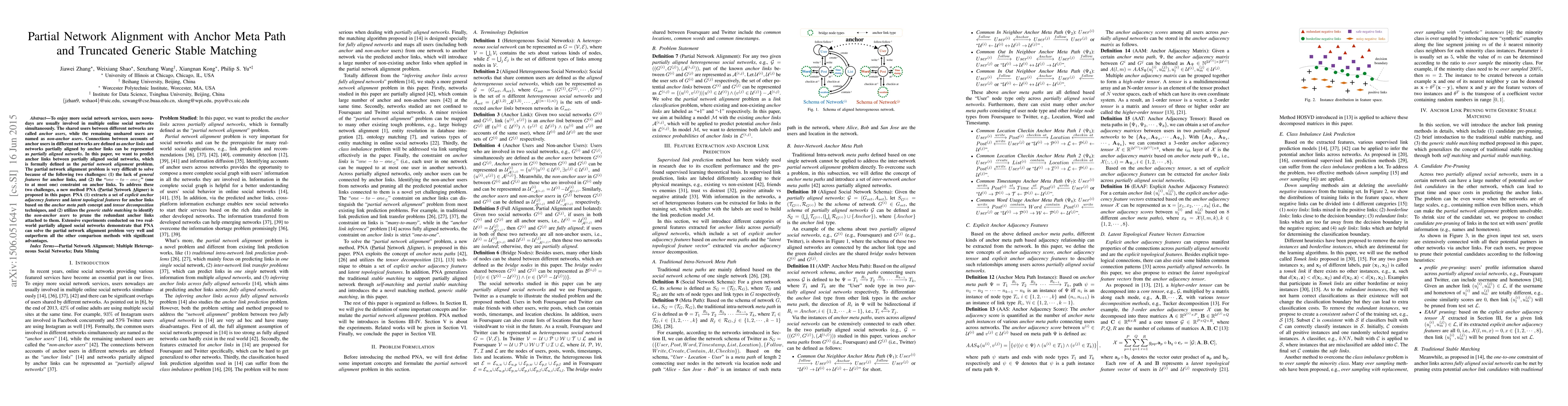 This paper proposes a new method, PNA, to solve the partial network alignment problem by predicting anchor links between partially aligned social networks. PNA extracts anchor adjacency features and utilizes generic stable matching to identify and prune non-anchor users, significantly outperforming other methods in experiments on real-world datasets.