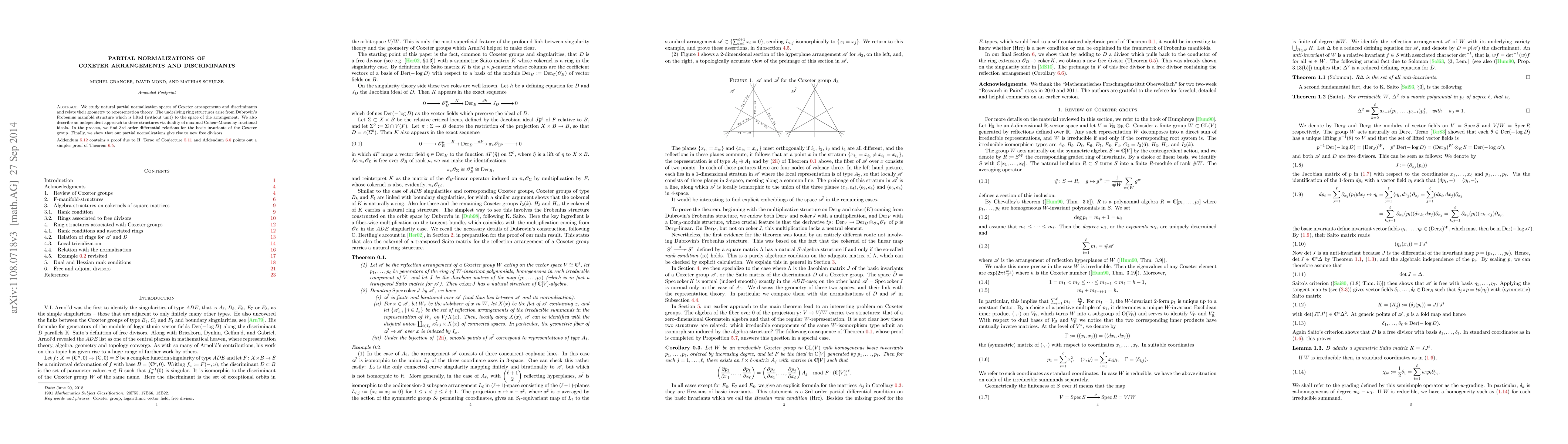 This paper explores the geometry of partial normalization spaces of Coxeter arrangements and their discriminants, linking these structures to representation theory through Dubrovin's Frobenius manifold and maximal Cohen-Macaulay fractional ideals. It uncovers third-order differential relations for Coxeter group invariants and reveals new free divisors from these normalizations.