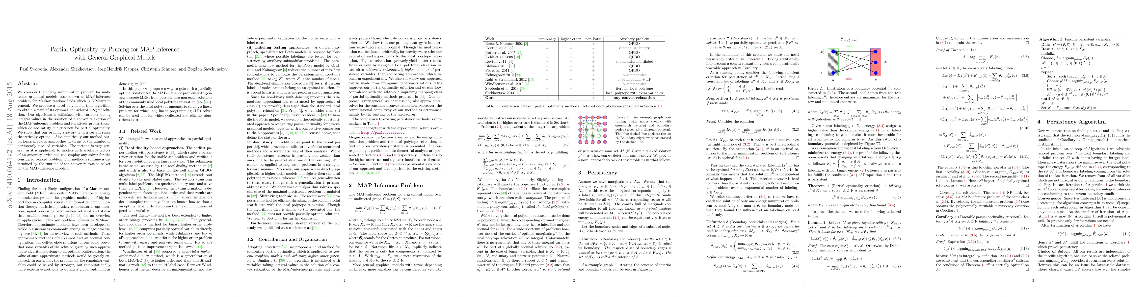 We consider the energy minimization problem for undirected graphical models, also known as MAP-inference problem for Markov random fields which is NP-hard in general. We propose a novel polynomial time algorithm to obtain a part of its optimal non-relaxed integral solution. Our algorithm is initialized with variables taking integral values in the solution of a convex relaxation of the MAP-inference problem and iteratively prunes those, which do not satisfy our criterion for partial optimality. We show that our pruning strategy is in a certain sense theoretically optimal. Also empirically our method outperforms previous approaches in terms of the number of persistently labelled variables. The method is very general, as it is applicable to models with arbitrary factors of an arbitrary order and can employ any solver for the considered relaxed problem. Our method's runtime is determined by the runtime of the convex relaxation solver for the MAP-inference problem.