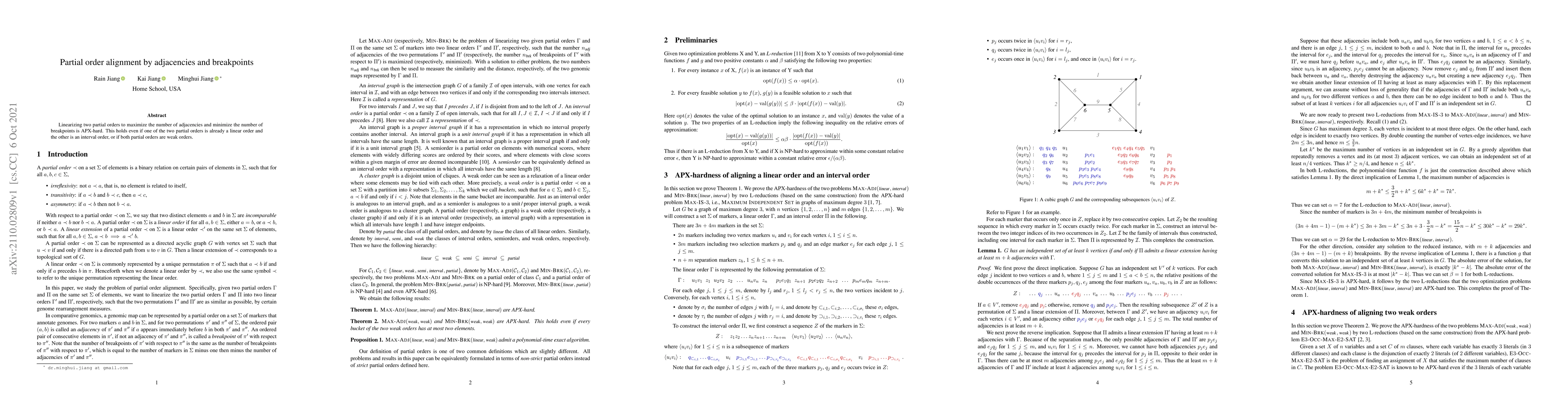 Linearizing two partial orders to maximize the number of adjacencies and minimize the number of breakpoints is APX-hard. This holds even if one of the two partial orders is already a linear order and the other is an interval order, or if both partial orders are weak orders.