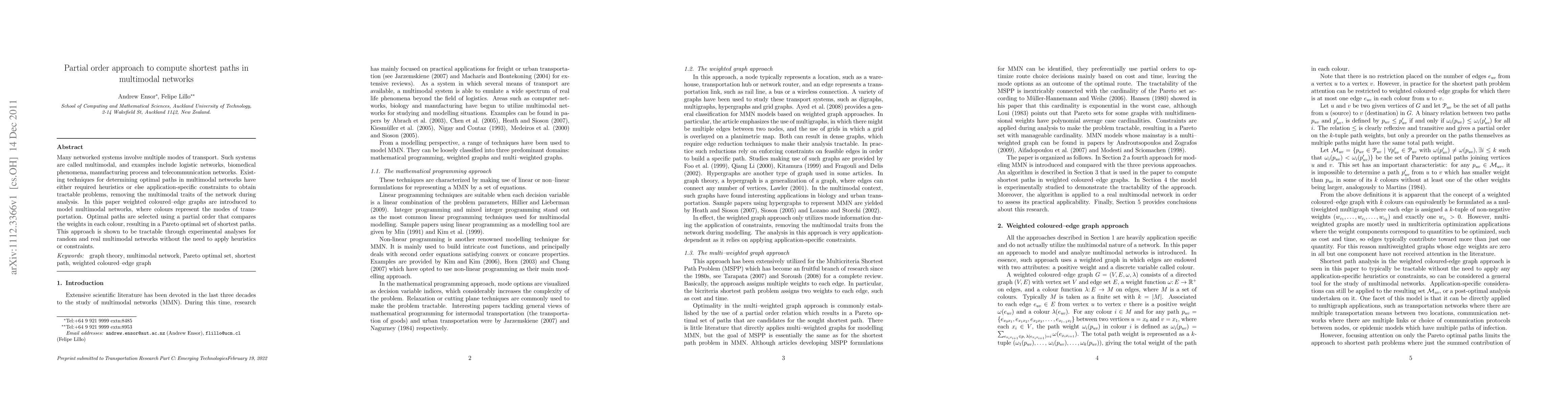 Many networked systems involve multiple modes of transport. Such systems are called multimodal, and examples include logistic networks, biomedical phenomena, manufacturing process and telecommunication networks. Existing techniques for determining optimal paths in multimodal networks have either required heuristics or else application-specific constraints to obtain tractable problems, removing the multimodal traits of the network during analysis. In this paper weighted coloured--edge graphs are introduced to model multimodal networks, where colours represent the modes of transportation. Optimal paths are selected using a partial order that compares the weights in each colour, resulting in a Pareto optimal set of shortest paths. This approach is shown to be tractable through experimental analyses for random and real multimodal networks without the need to apply heuristics or constraints.