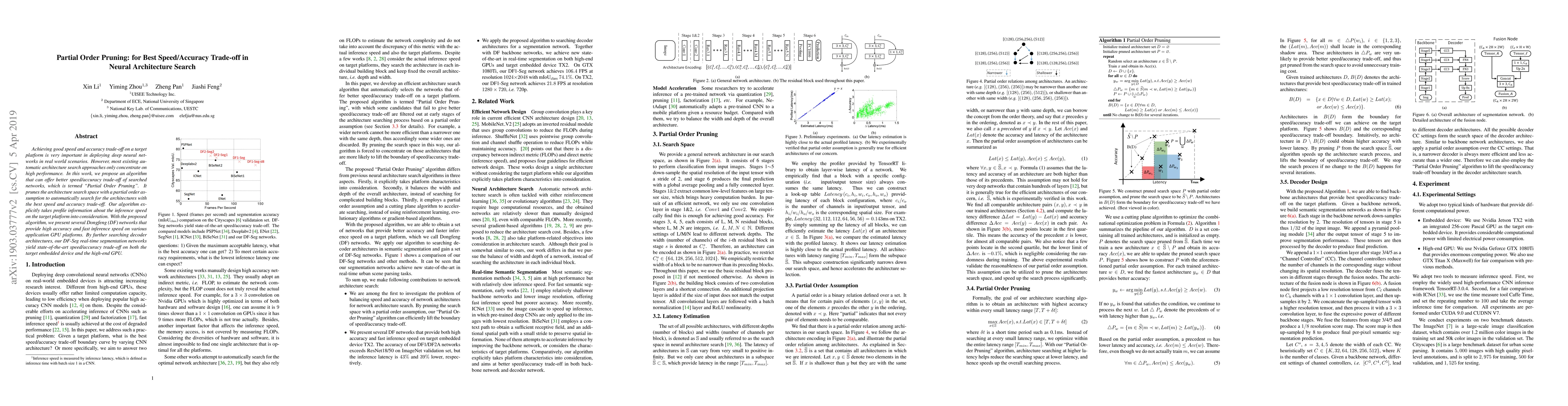 Achieving good speed and accuracy trade-off on a target platform is very important in deploying deep neural networks in real world scenarios. However, most existing automatic architecture search approaches only concentrate on high performance. In this work, we propose an algorithm that can offer better speed/accuracy trade-off of searched networks, which is termed "Partial Order Pruning". It prunes the architecture search space with a partial order assumption to automatically search for the architectures with the best speed and accuracy trade-off. Our algorithm explicitly takes profile information about the inference speed on the target platform into consideration. With the proposed algorithm, we present several Dongfeng (DF) networks that provide high accuracy and fast inference speed on various application GPU platforms. By further searching decoder architectures, our DF-Seg real-time segmentation networks yield state-of-the-art speed/accuracy trade-off on both the target embedded device and the high-end GPU.