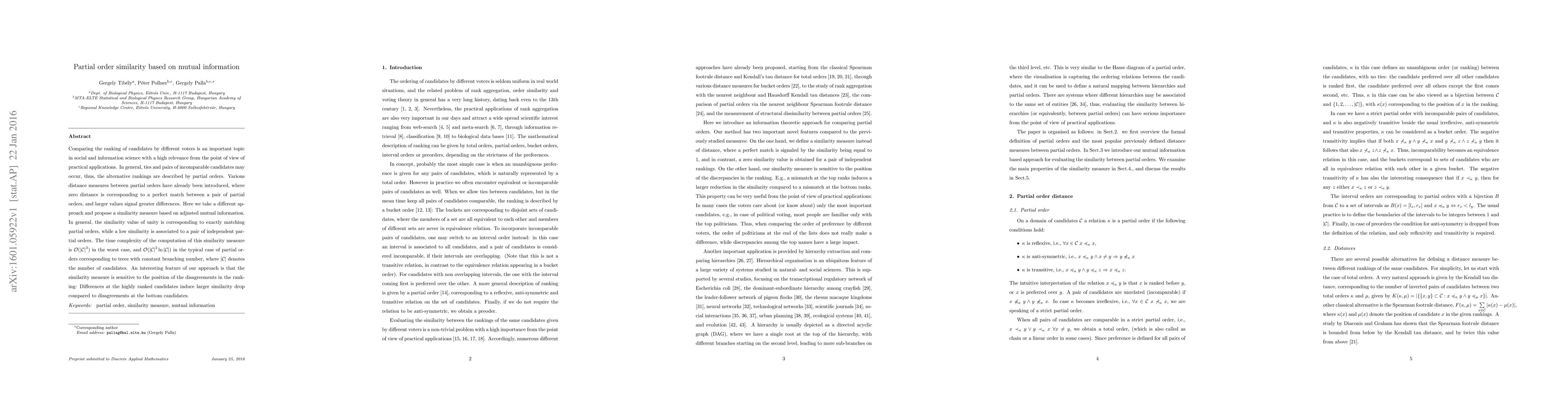 Comparing the ranking of candidates by different voters is an important topic in social and information science with a high relevance from the point of view of practical applications. In general, ties and pairs of incomparable candidates may occur, thus, the alternative rankings are described by partial orders. Various distance measures between partial orders have already been introduced, where zero distance is corresponding to a perfect match between a pair of partial orders, and larger values signal greater differences. Here we take a different approach and propose a similarity measure based on adjusted mutual information. In general, the similarity value of unity is corresponding to exactly matching partial orders, while a low similarity is associated to a pair of independent partial orders. The time complexity of the computation of this similarity measure is $\mathcal{O}(\left|{\mathcal C}\right|^3)$ in the worst case, and $\mathcal{O}(\left|{\mathcal C}\right|^2\ln \left|{\mathcal C}\right|)$ in the typical case of partial orders corresponding to trees with constant branching number, where $\left|{\mathcal C}\right|$ denotes the number of candidates. An interesting feature of our approach is that the similarity measure is sensitive to the position of the disagreements in the ranking: Differences at the highly ranked candidates induce larger similarity drop compared to disagreements at the bottom candidates.