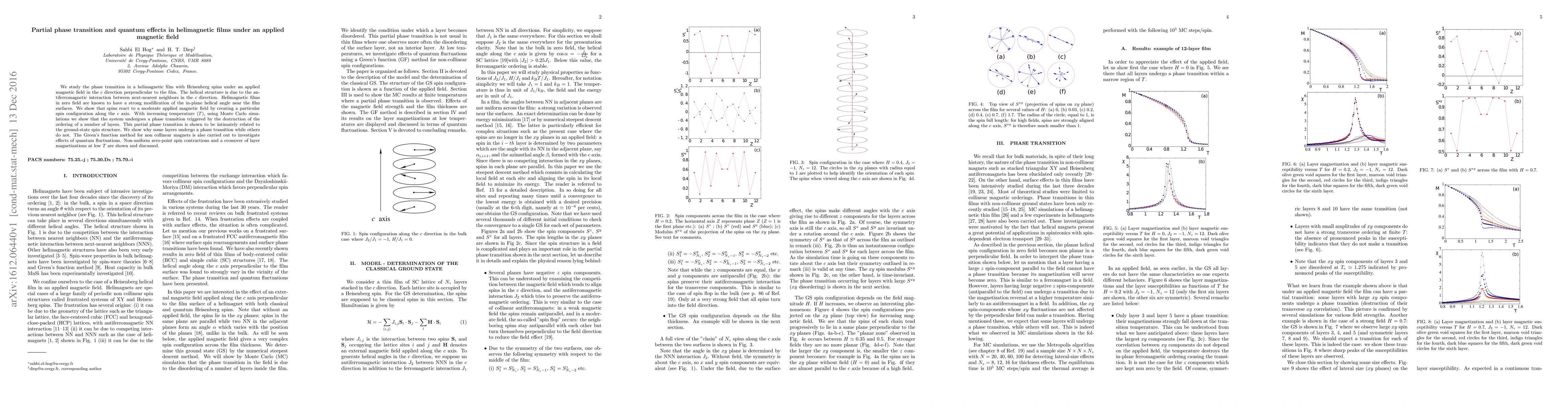 Researchers study how applied magnetic fields affect helimagnetic films, finding a phase transition triggered by temperature changes that is linked to the film's spin structure. Quantum fluctuations also play a role in this transition, leading to non-uniform effects at low temperatures.